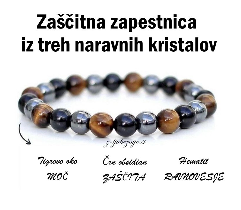Energijska zapestnica iz naravnih kamnov - kristalov hematita, obsidiana in tigrovega očesa