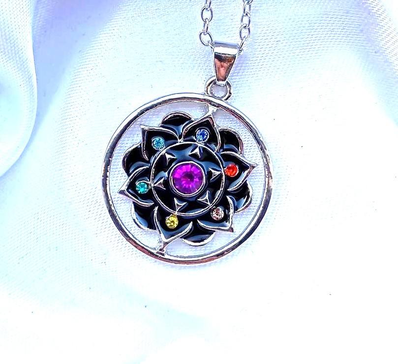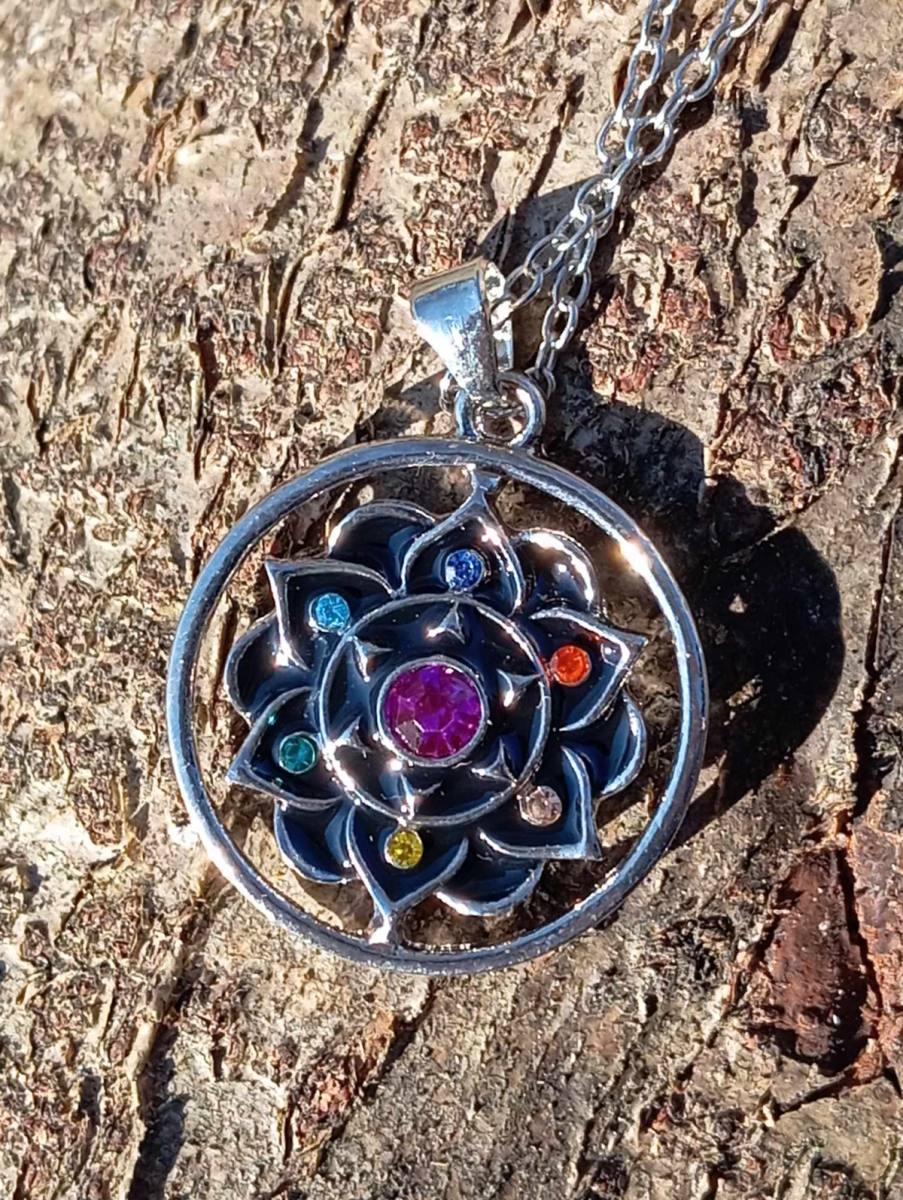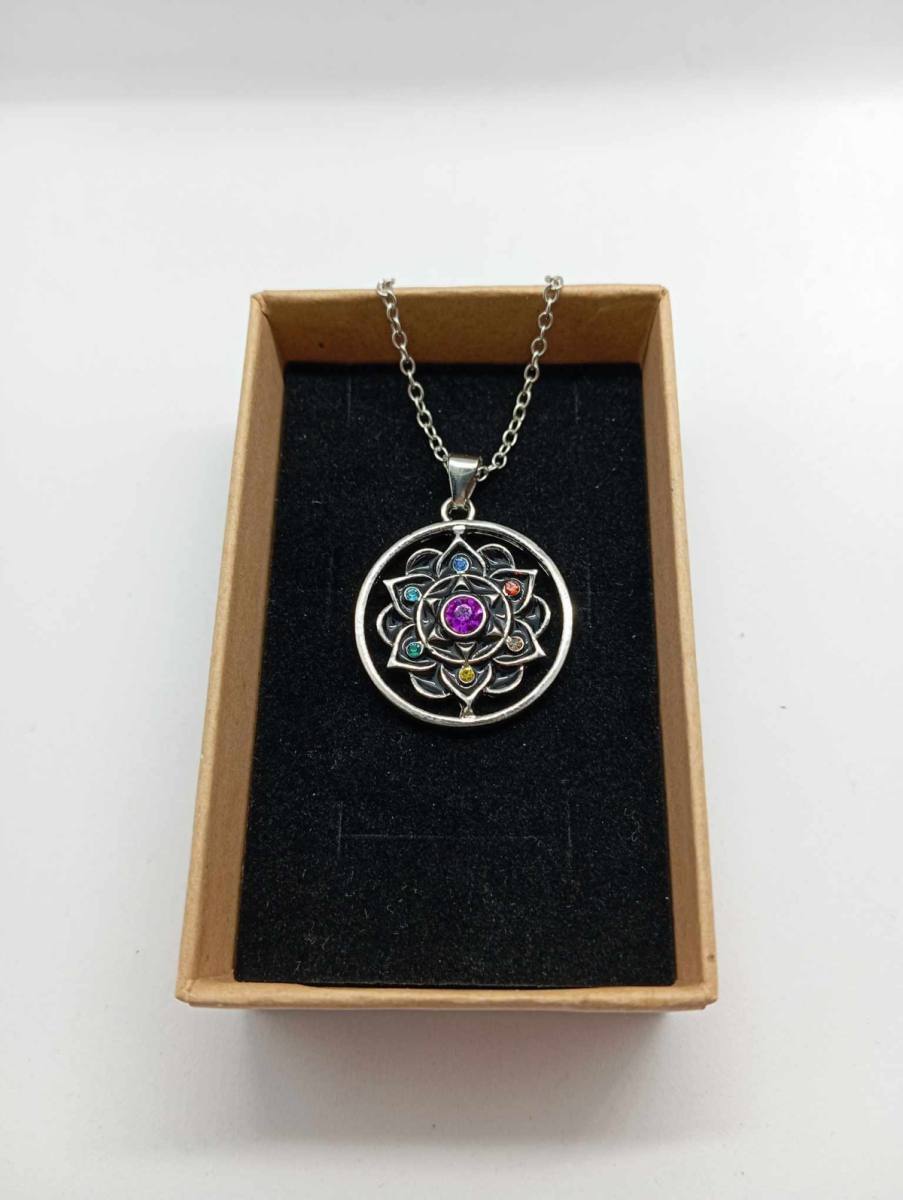 Čakre so energijski centri v telesu, skozi katere naj bi krožila življenjska energija. Vsaka čakra je povezana z določenimi vidiki človeškega življenja in ima svojo barvo ter energijsko frekvenco. Ogrlica amulet iz jekla z barvnimi kristalčki, ki so povezani z različnimi čakrami, nosi globok duhovni pomen.