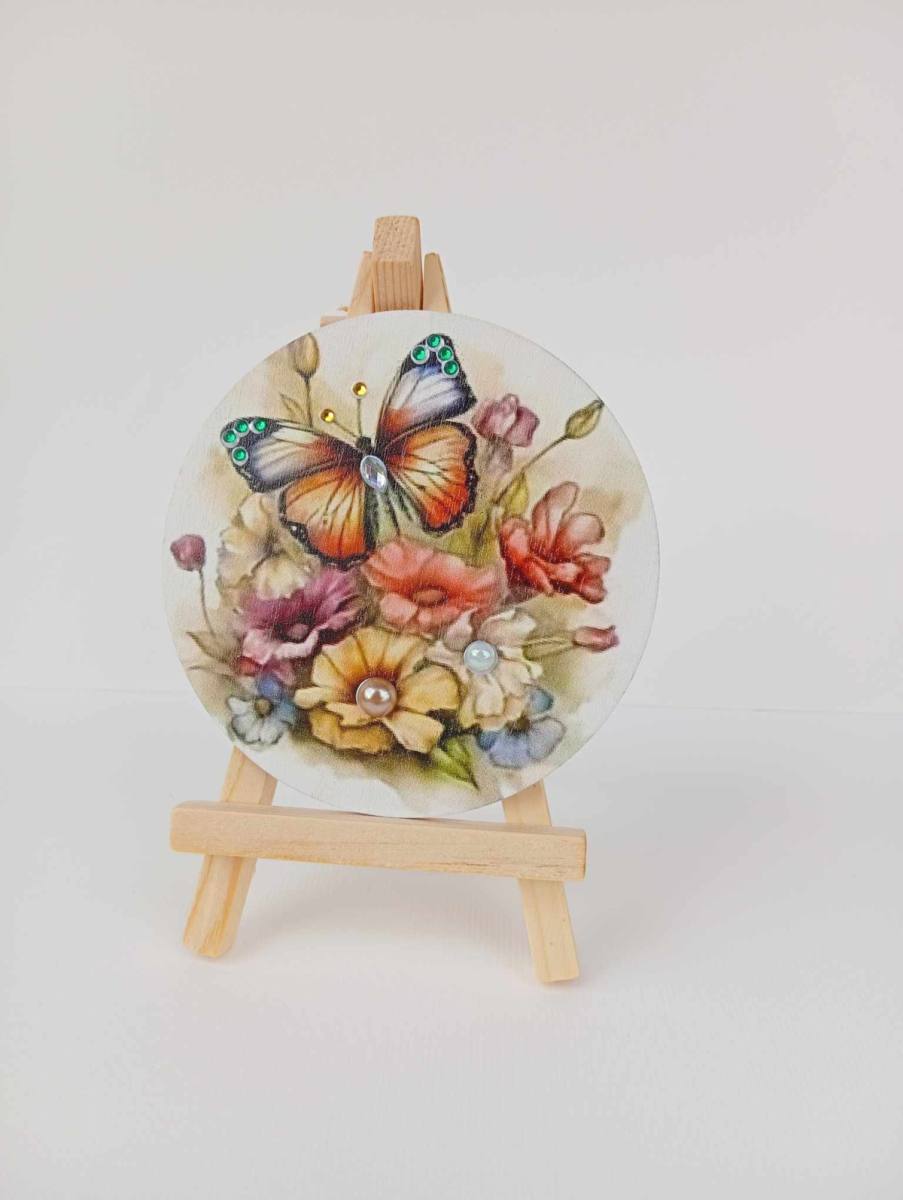 Namizna slika metulja na lesu z lesenim podstavkom je mnogo več kot le dekoracija. Njena okrogla oblika, premera 10 cm, simbolizira popolnost in neskončnost. Okrogla oblika nas spominja na celovitost in cikle življenja, kar v kombinaciji z metuljem poudarja neprekinjen proces spremembe in preobrazbe.