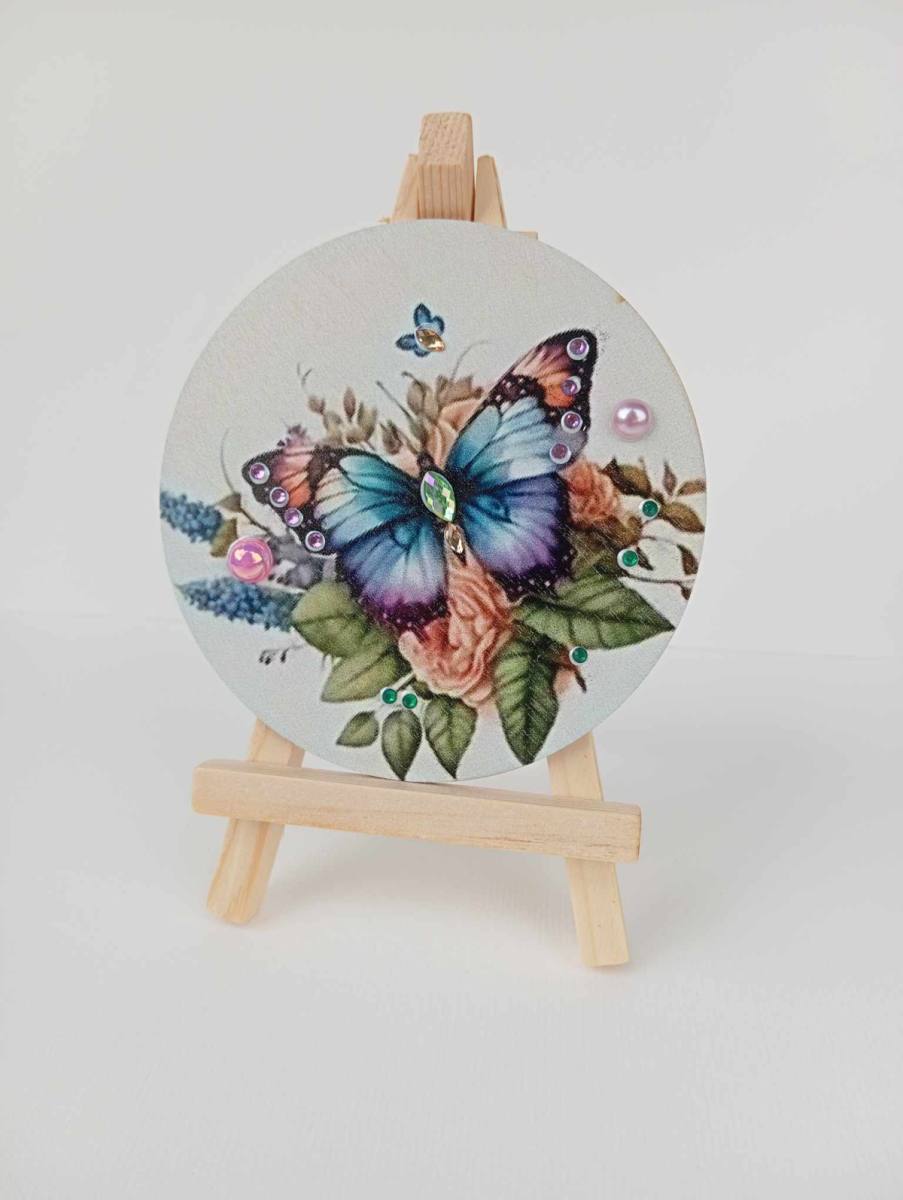 Namizna slika metulja na lesu z lesenim podstavkom je mnogo več kot le dekoracija. Njena okrogla oblika, premera 10 cm, simbolizira popolnost in neskončnost. Okrogla oblika nas spominja na celovitost in cikle življenja, kar v kombinaciji z metuljem poudarja neprekinjen proces spremembe in preobrazbe.