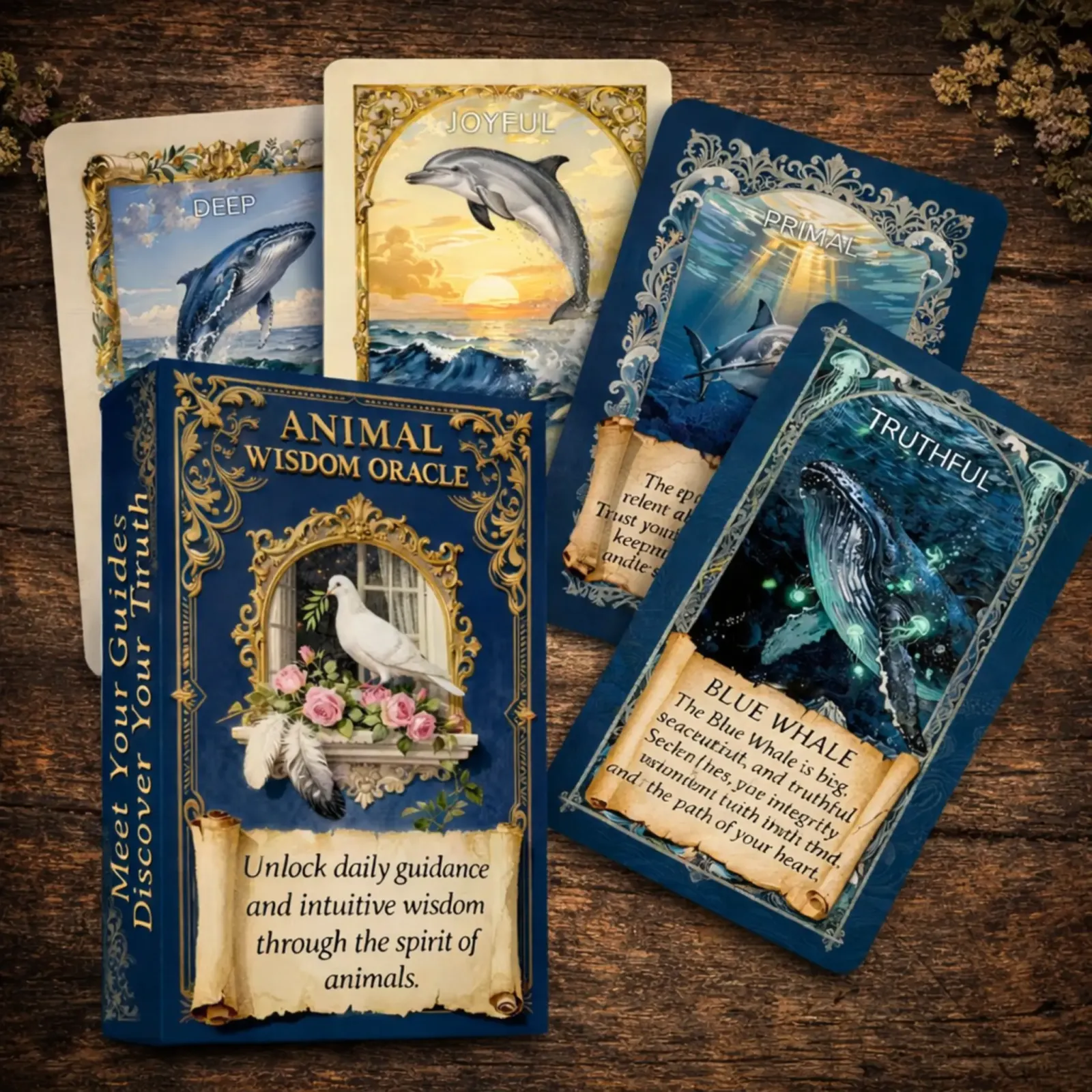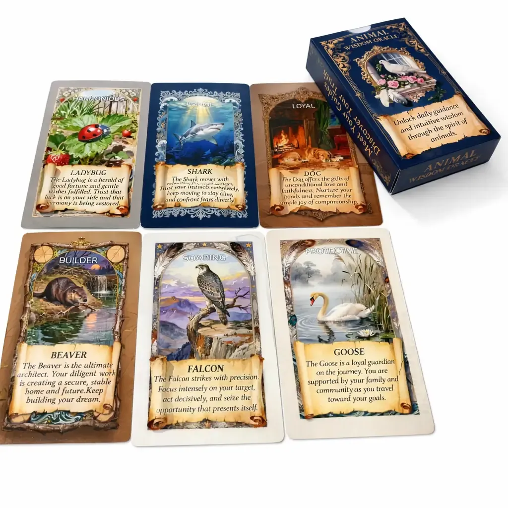 Orakelj živalske modrosti vsebuje 55 kart – 55 živalskih vodnikov, ki te nežno vodijo, podpirajo in usmerjajo na tvoji poti. Vsaka karta je kot srečanje z dušo živali, ki te v pravem trenutku pokliče, da ti preda modrost, ki jo potrebuješ.