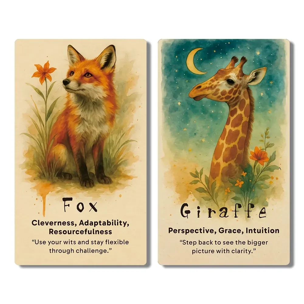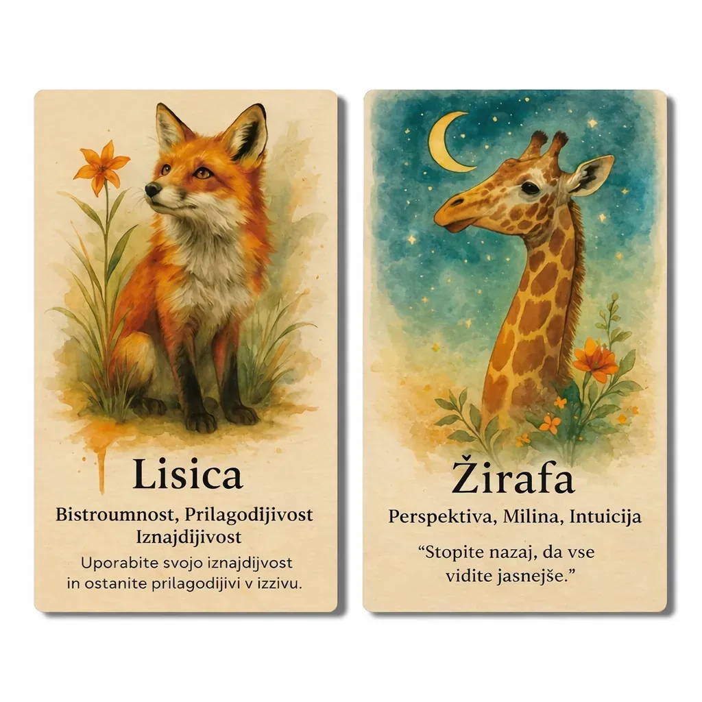 Priložena je tudi skripta v slovenskem jeziku, ki ponuja poglobljene opise in duhovno vodstvo za 150 divjih in domačih živali. Ne le pomen, temveč razumevanje – kako nas posamezna žival vodi, kaj nas uči in kako njeno sporočilo uporabiti v vsakdanjem življenju.