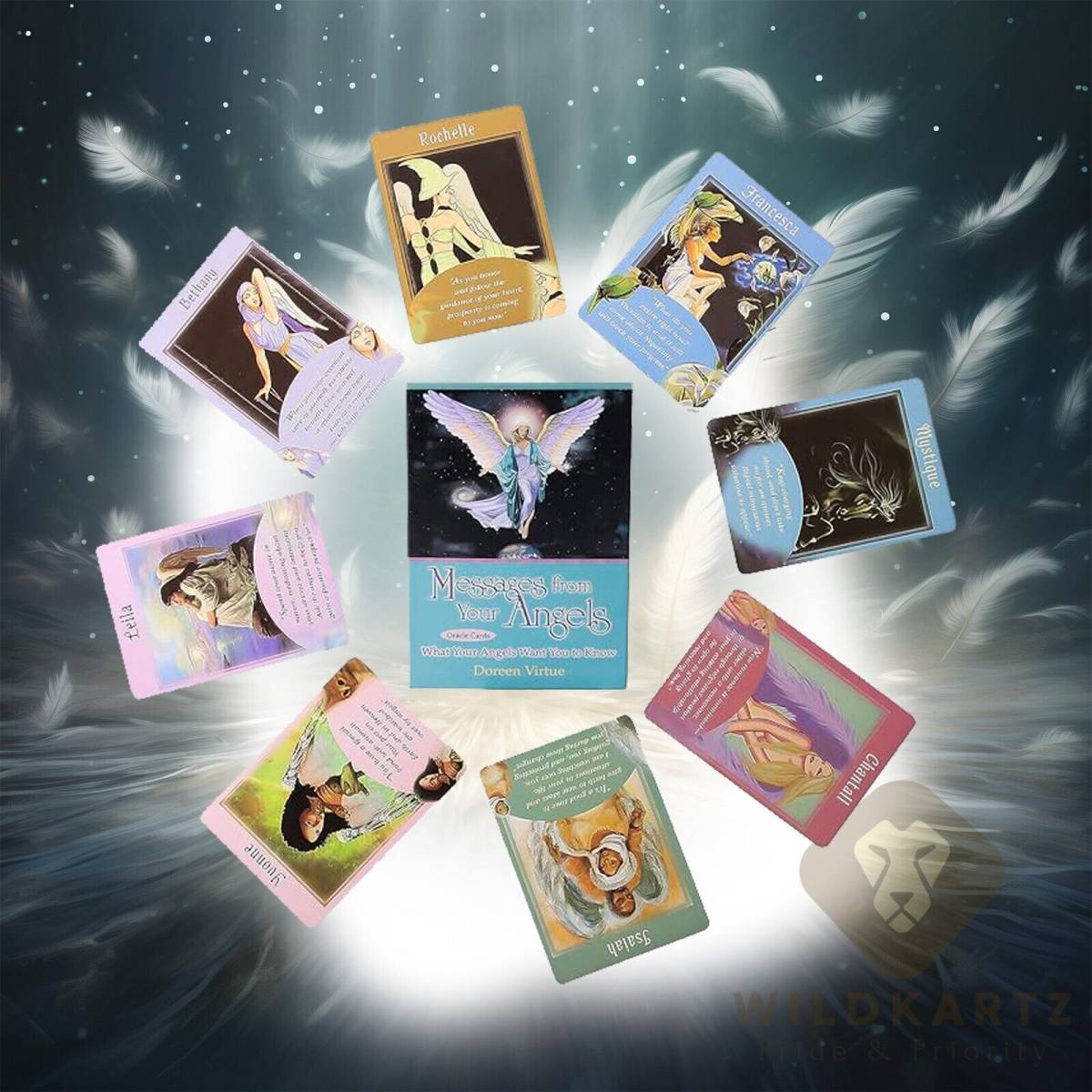 Karte "Messages from Your Angels" Doreen Virtue so angelske orakeljske karte, ki so zasnovane za iskanje duhovnih vodstev, jasnosti in spodbud pri vsakodnevnih izzivih. Komplet vsebuje 44 kart, vsaka pa je povezana z določenim angelom, ki prinaša sporočilo, nasvet ali navdih. Karte so nežno ilustrirane z angelskimi podobami in vsakokratno sporočilo ponuja globok uvid ter povabilo, da se zaupate božanskemu vodstvu.