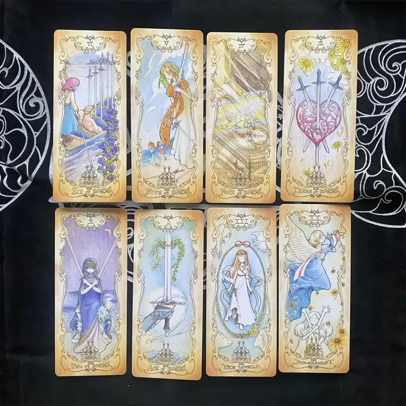 "Krila svetlobe" so čarobne karte, ki s svojo nežno eleganco in globoko simboliko vodijo iskalce skozi svetove, kjer se srečujejo dimenzije duha, nezavednega in božanskega. Te karte niso zgolj orodje, temveč most med svetom, ki ga poznamo, in skrivnostnimi sferami, kjer prebivajo čarobna bitja – angeli, vilinske kraljice, mistični varuhi in svetlobni vodniki.