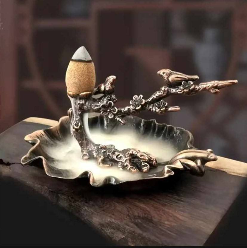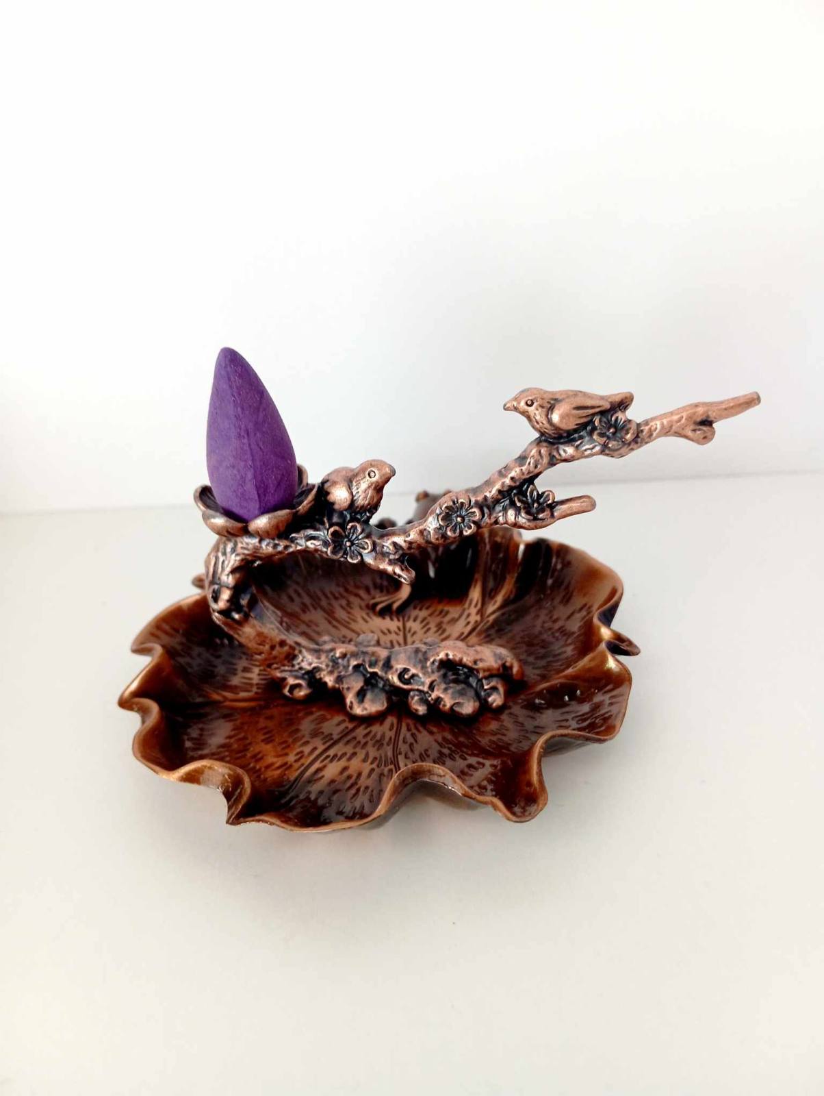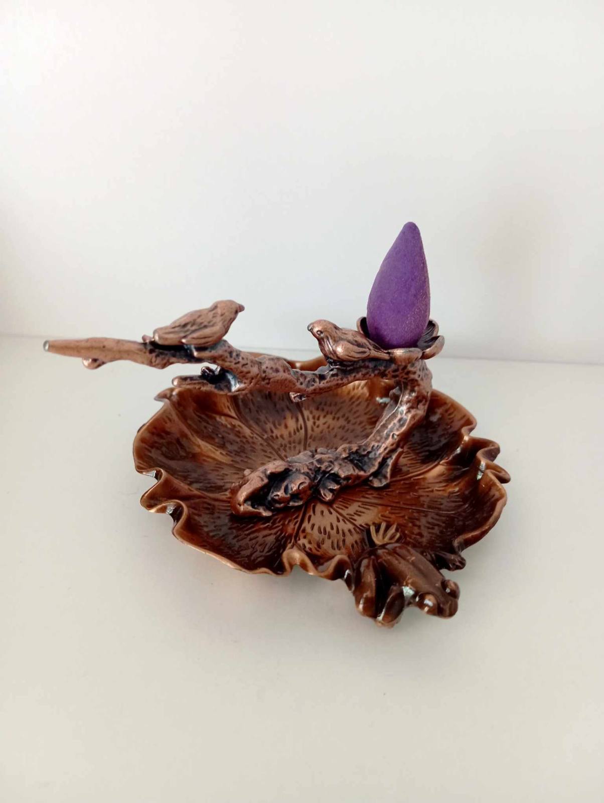 Izdelan iz umetelno oblikovane kovine in posnema list v razcvetu, z nežnimi bakrenimi vejami, po katerih počivajo dve drobni ptici. Ko na njegovo hrbtišče položite kadilni stožec in ga prižgete, se zrak napolni z nežno aromo, dim pa se kot tančica spušča navzdol, ovijajoč vejice, ptičke in robove posode. Ta trenutek ni le vizualen – je čutno doživetje, ki vas popelje v globlji stik s samim seboj.