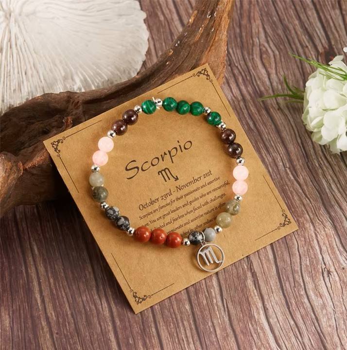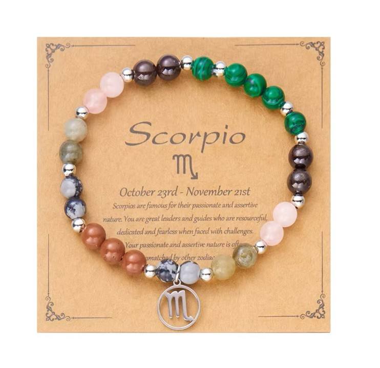 Naravni kristali na zapestnici Škorpijonu prinašajo ravnovesje, saj mu pomagajo uravnotežiti intenzivna čustva in jih usmeriti v ustvarjalnost. Kristali so nastali skozi tisočletja v globinah zemlje, zato nosijo energijo stabilnosti in čistosti. Ta mu omogoča, da lažje sprosti negativna čustva in se osredotoči na notranjo moč. Simbol Škorpijona poudari njegovo moč preobrazbe in intuicije, kristali pa mu pomagajo, da svojo intenzivnost uporablja kot dar, ne kot breme. Zapestnica tako postane njegov zaščitni talisman, ki mu daje notranji mir in jasnost.