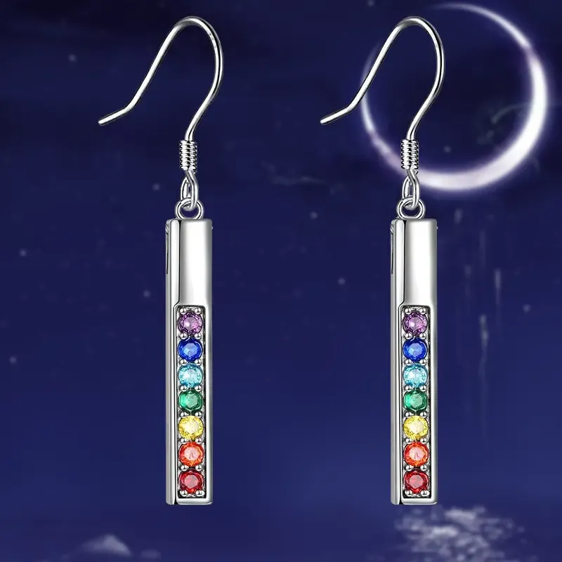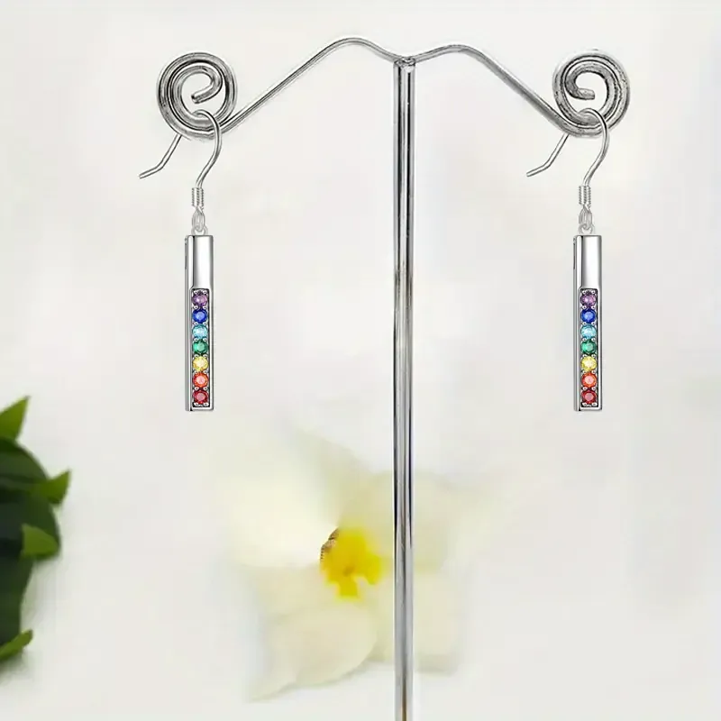 Čakra energijski uhani – moč barv so izraz harmonije, ravnovesja in prefinjene elegance. Sedem barvnih kristalov, vdelanih v podolgovato kovinsko obliko, simbolizira sedem čaker – energijskih centrov telesa, skozi katere teče življenjska sila. Vsak kristal vibrira v svoji frekvenci in se ujema z določeno čakro, kar spodbuja pretočnost energije in notranje ravnovesje.