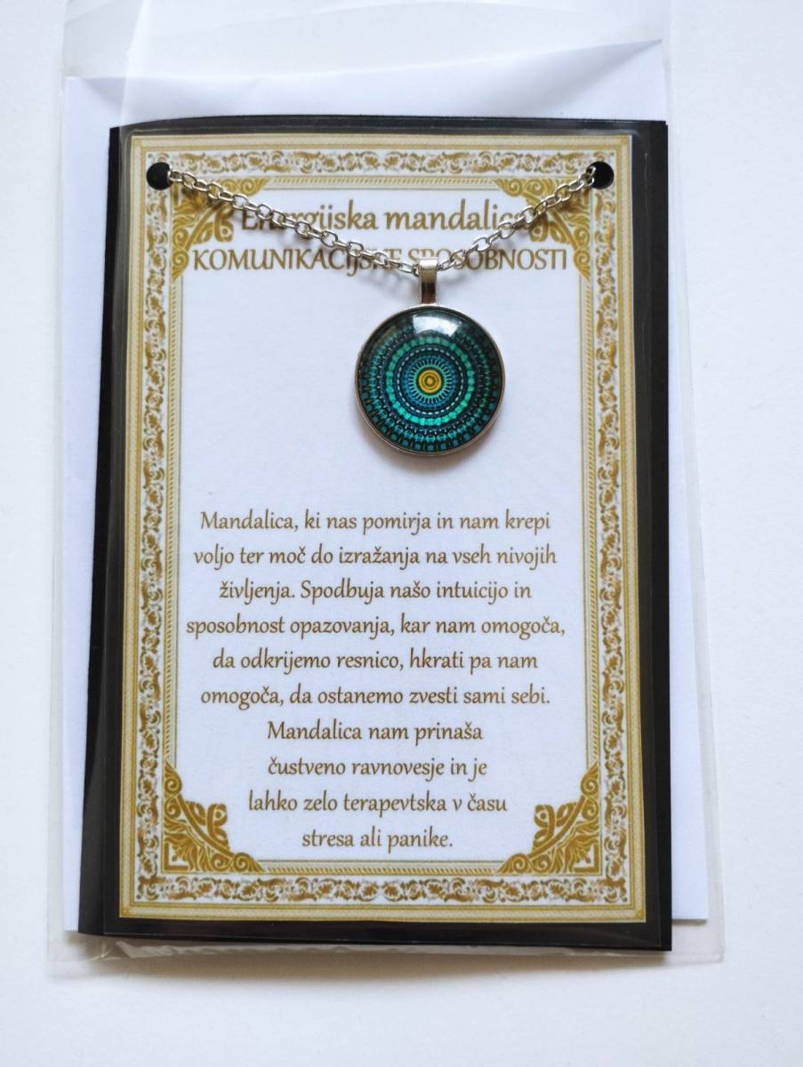 Ogrlica z energijsko mandalo je v darilni embalaži. Ta je v obliki vizitke, z opisom v cerificiranem plastificiranem okvirju, kar pomeni, da je lahko tudi čudovito darilo nekomu, ki nam je blizu.