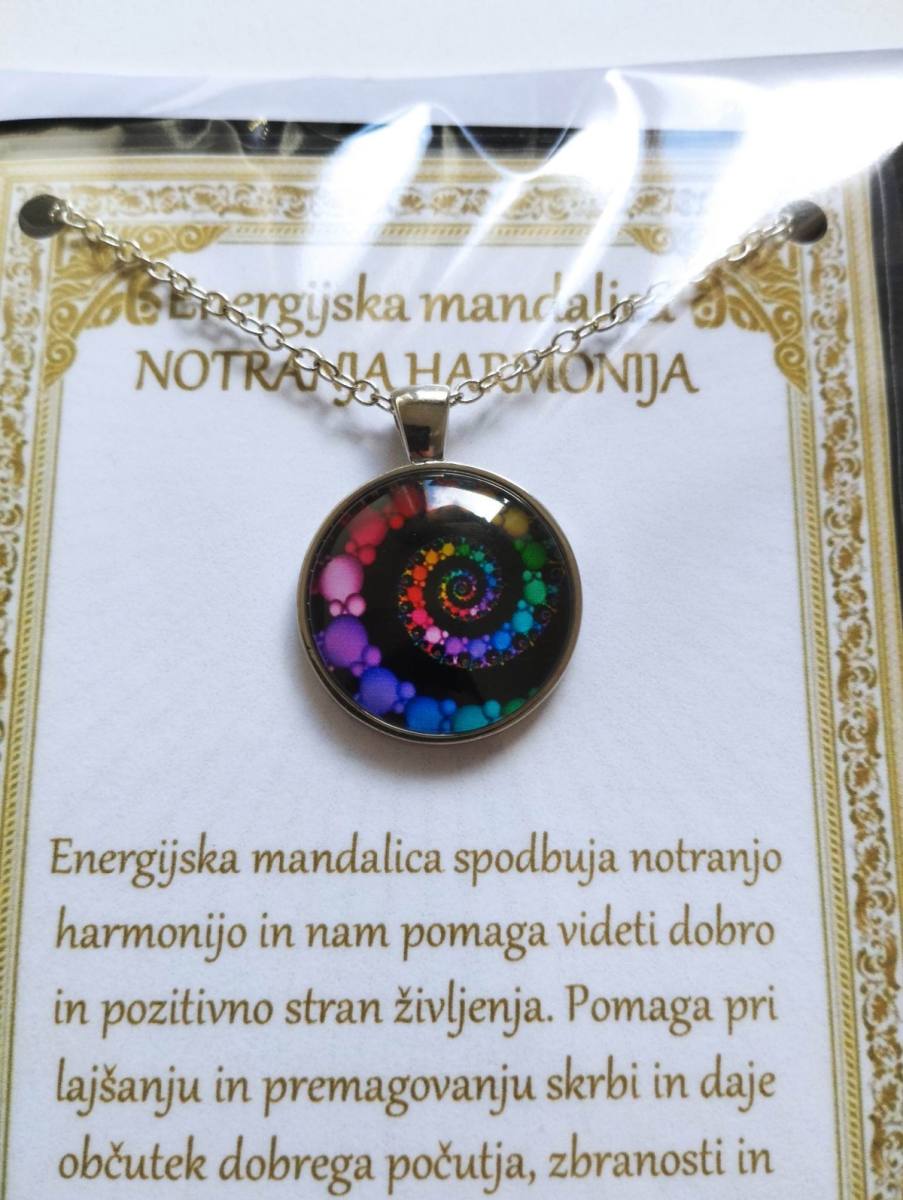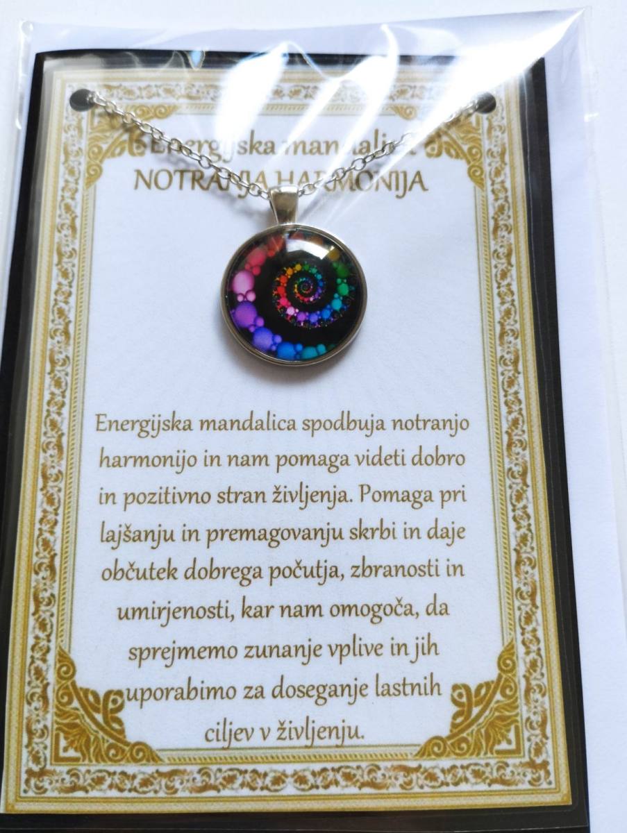 Ogrlica z energijsko mandalo je v darilni embalaži. Ta je v obliki vizitke, z opisom v cerificiranem plastificiranem okvirju, kar pomeni, da je lahko tudi čudovito darilo nekomu, ki nam je blizu.