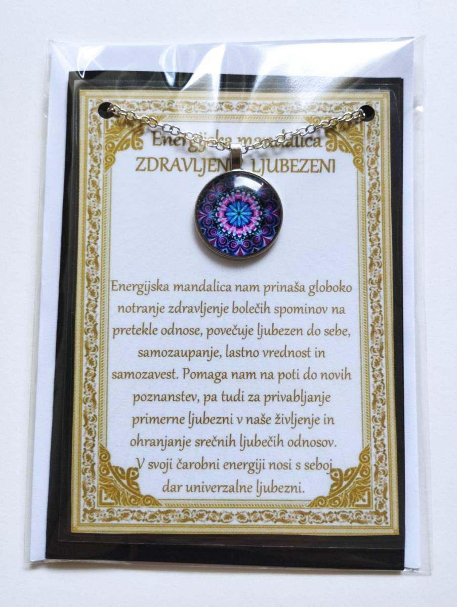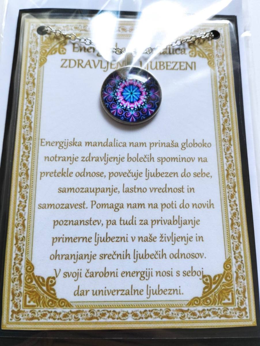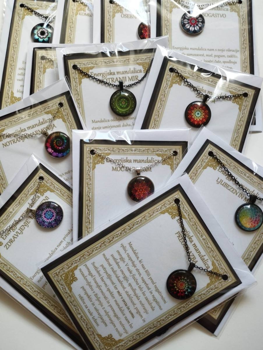 Ogrlica z energijsko mandalo je v darilni embalaži. Ta je v obliki vizitke, z opisom v cerificiranem plastificiranem okvirju, kar pomeni, da je lahko tudi čudovito darilo nekomu, ki nam je blizu.