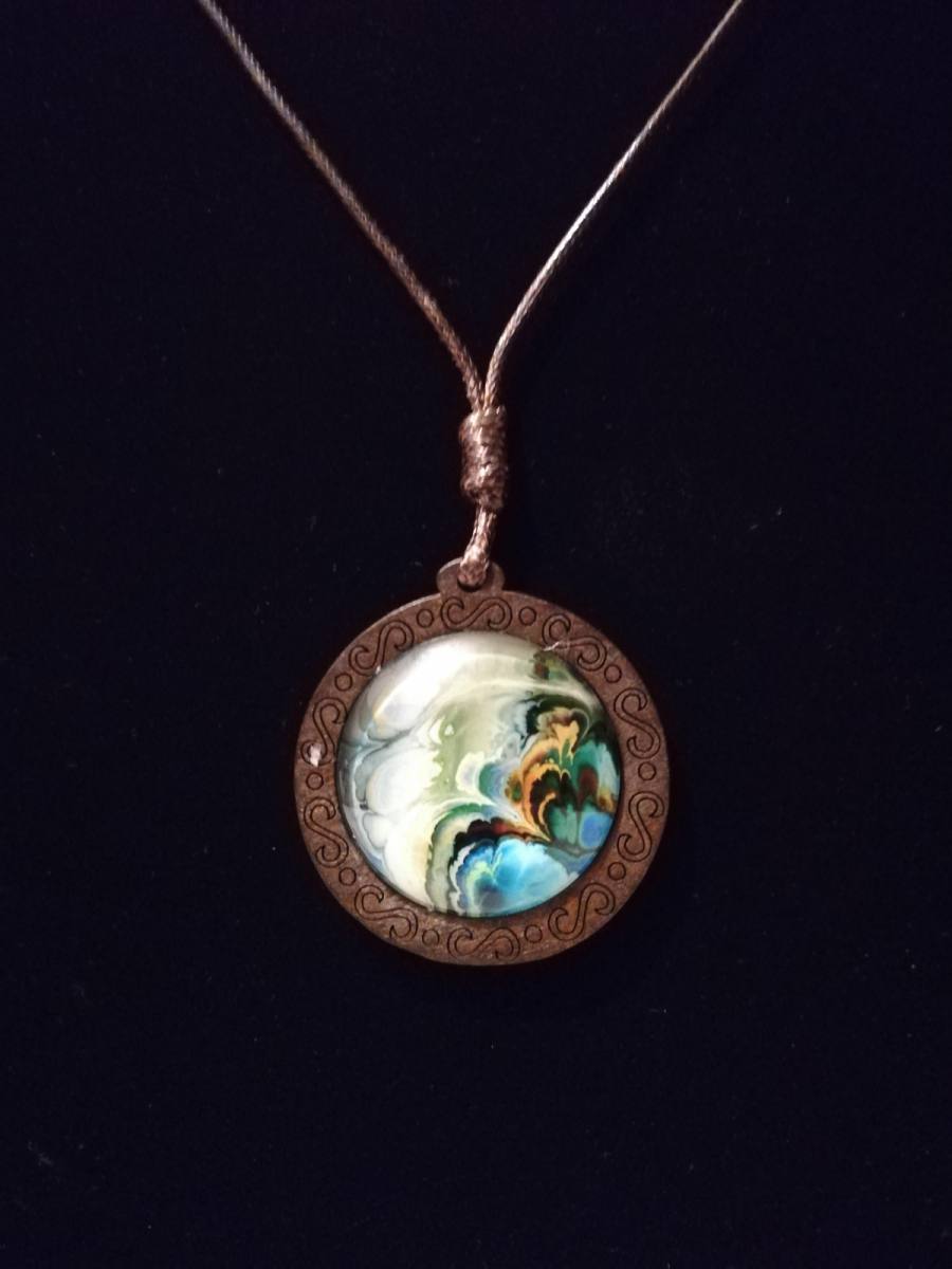 Osnova ogrlice je unikaten medaljon iz lesa.