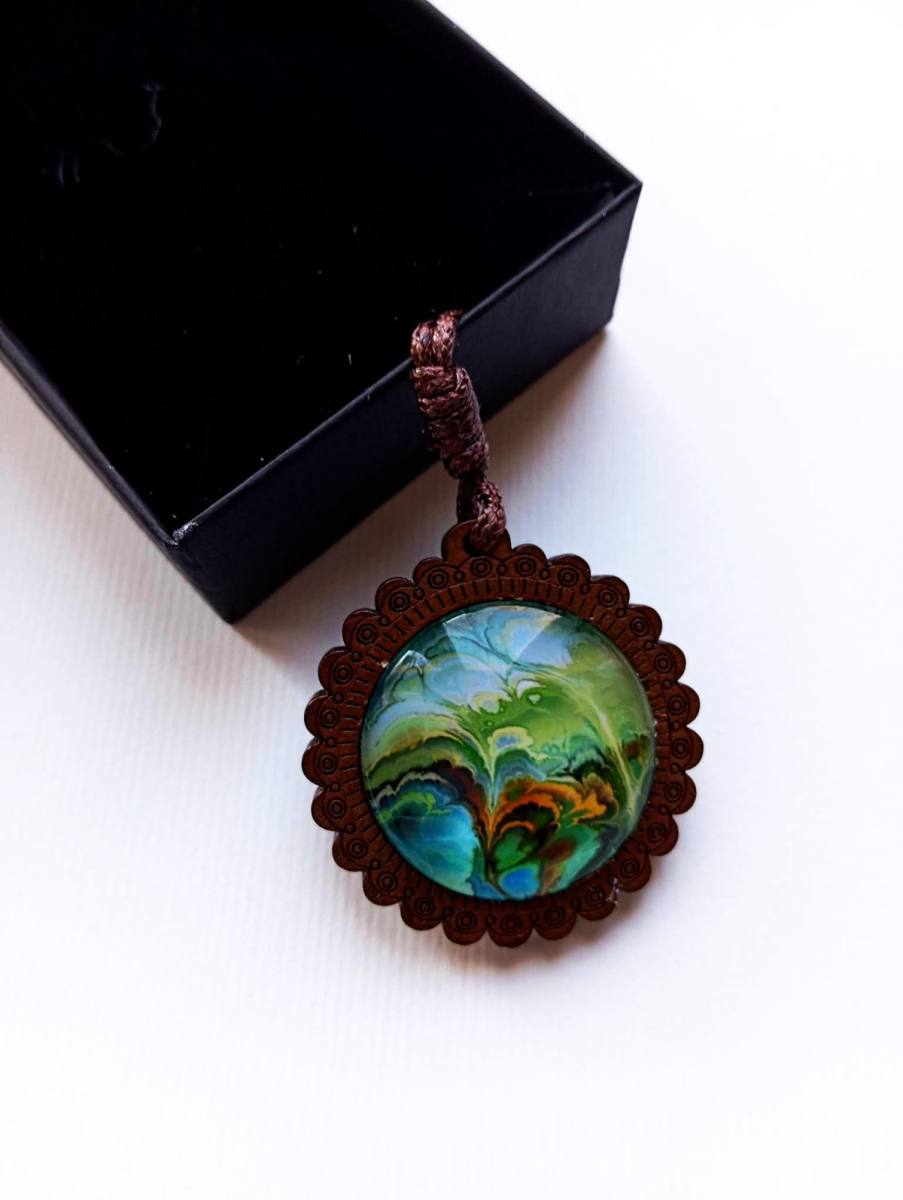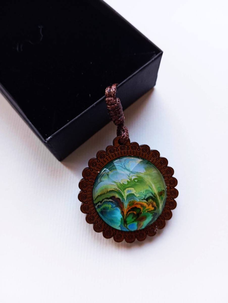 Osnova ogrlice je unikaten medaljon iz lesa.