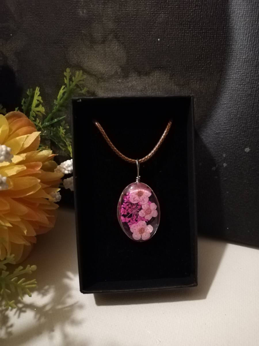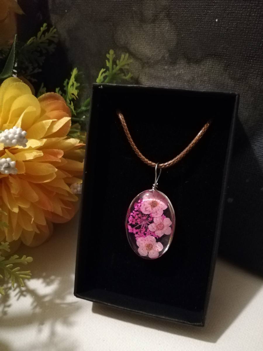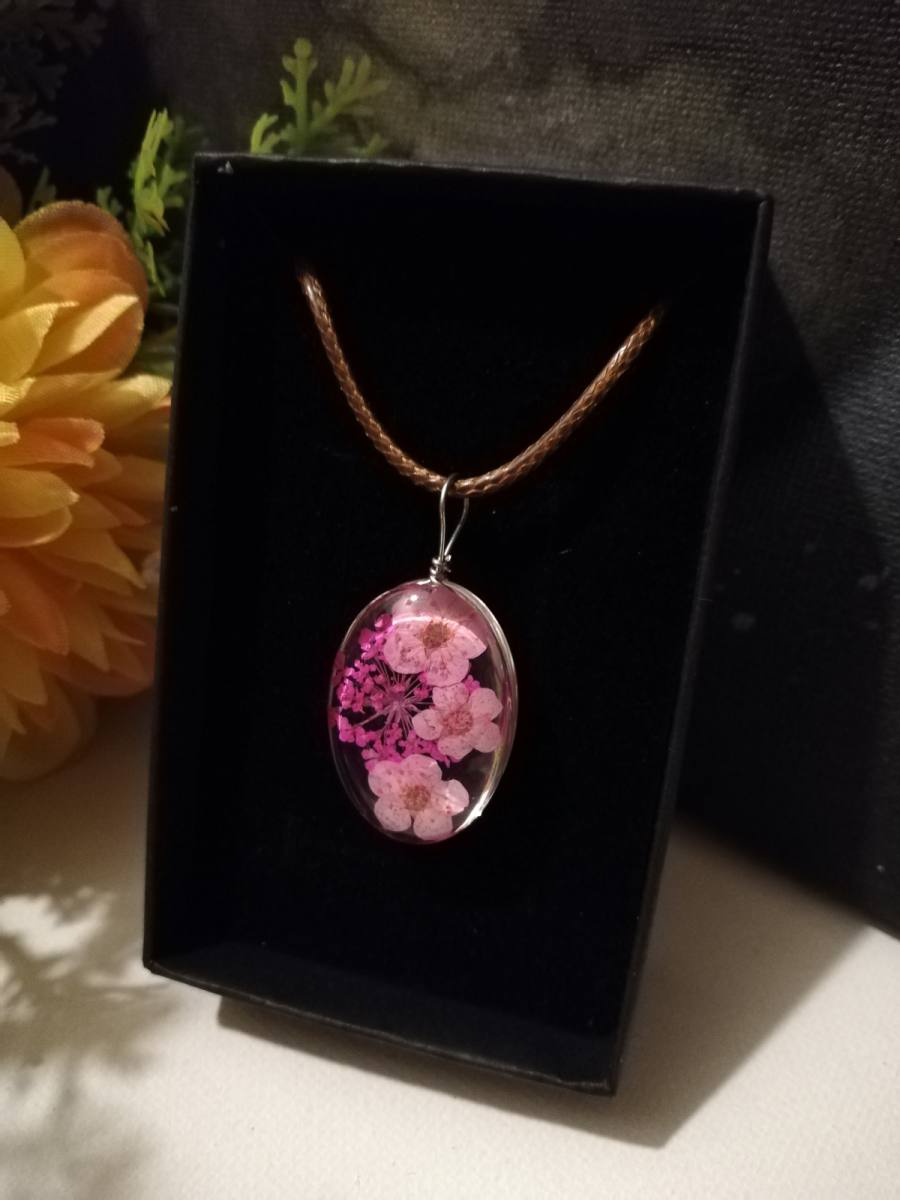Osnova ogrlice je močna rjava bombažna vrvica. Obesek je iz stekla-kristalne mase v kateri je vdelano suho prešano cvetje.