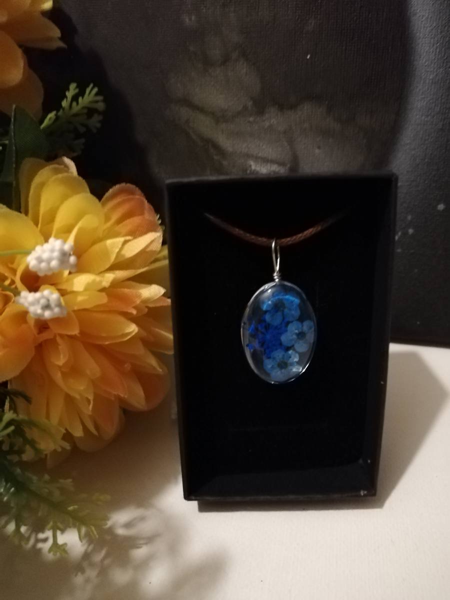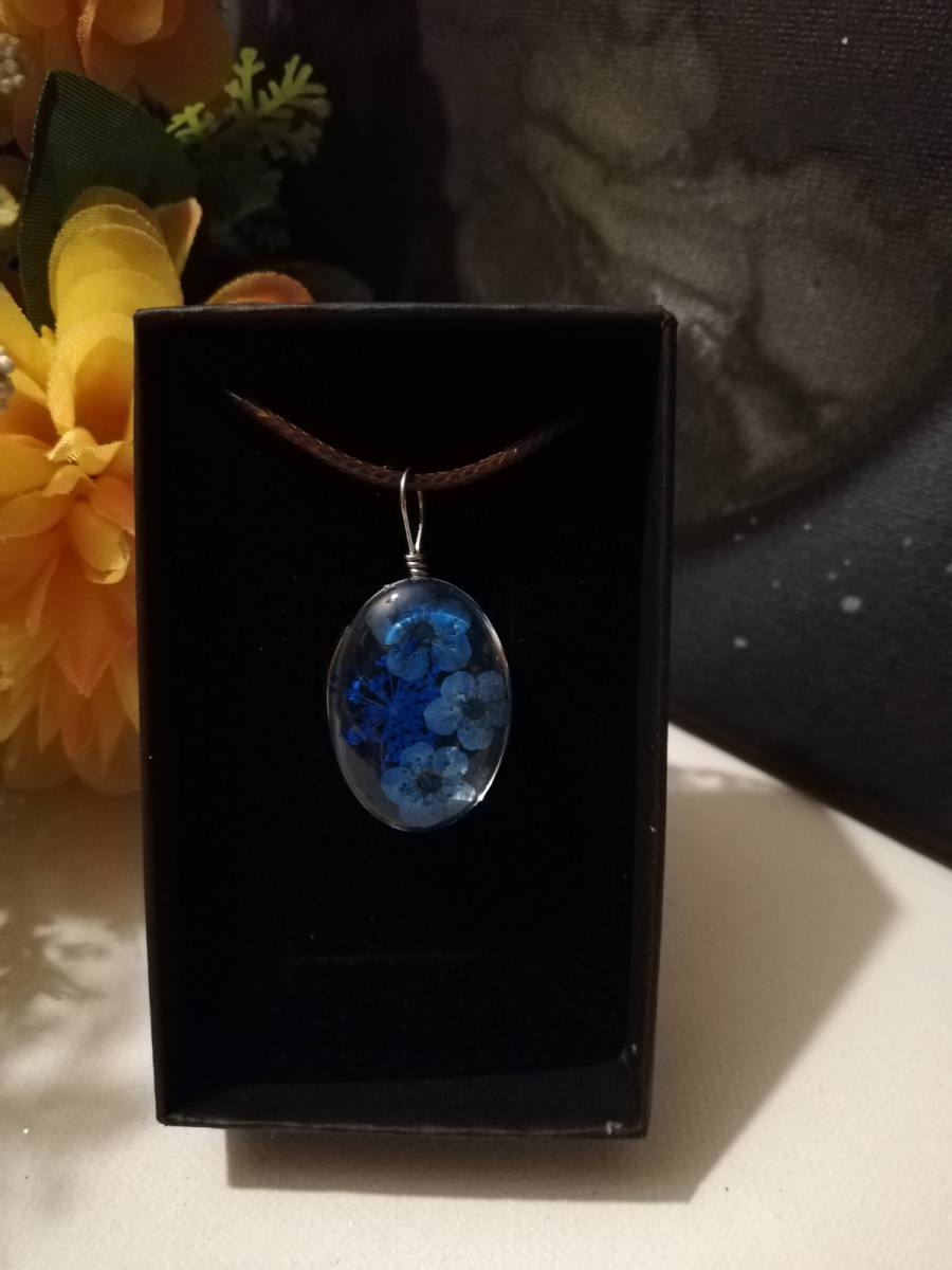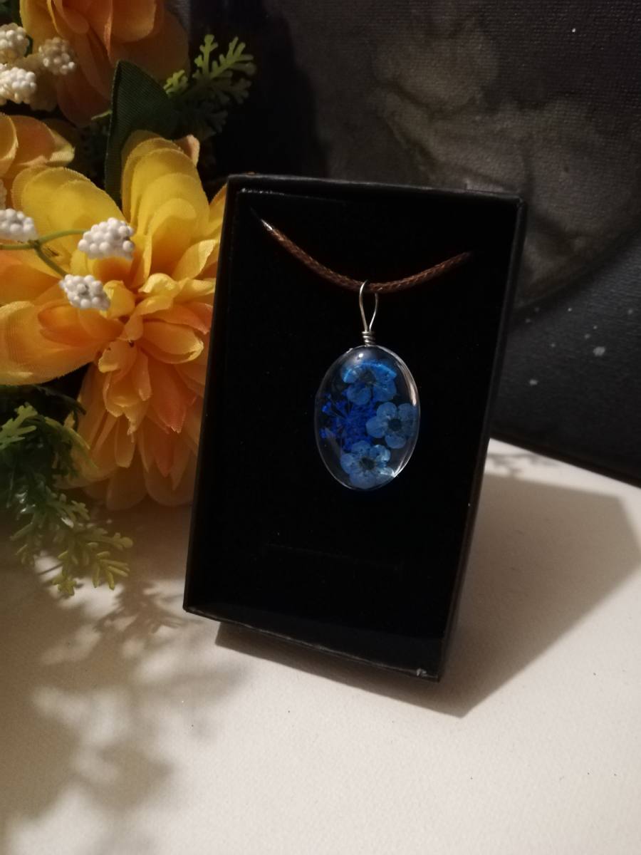 Ogrlica je iz kristalne mase v kateri je suho prešano cvetje