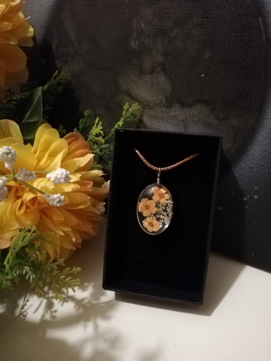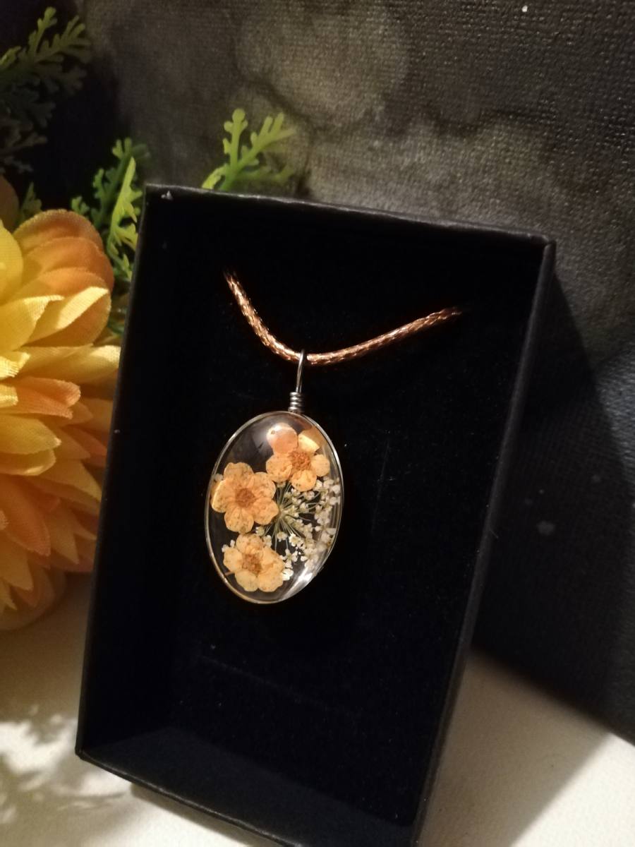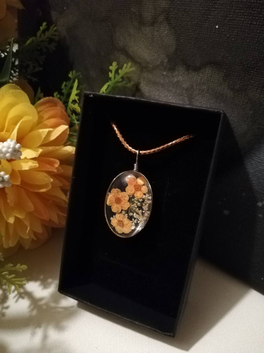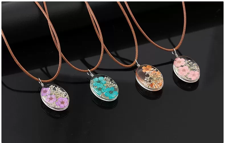 Ogrlica je iz kristalne mase v kateri je suho prešano cvetje