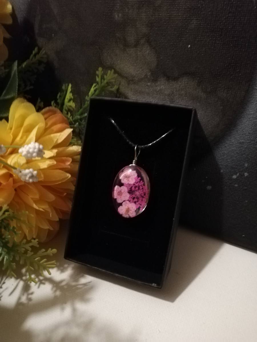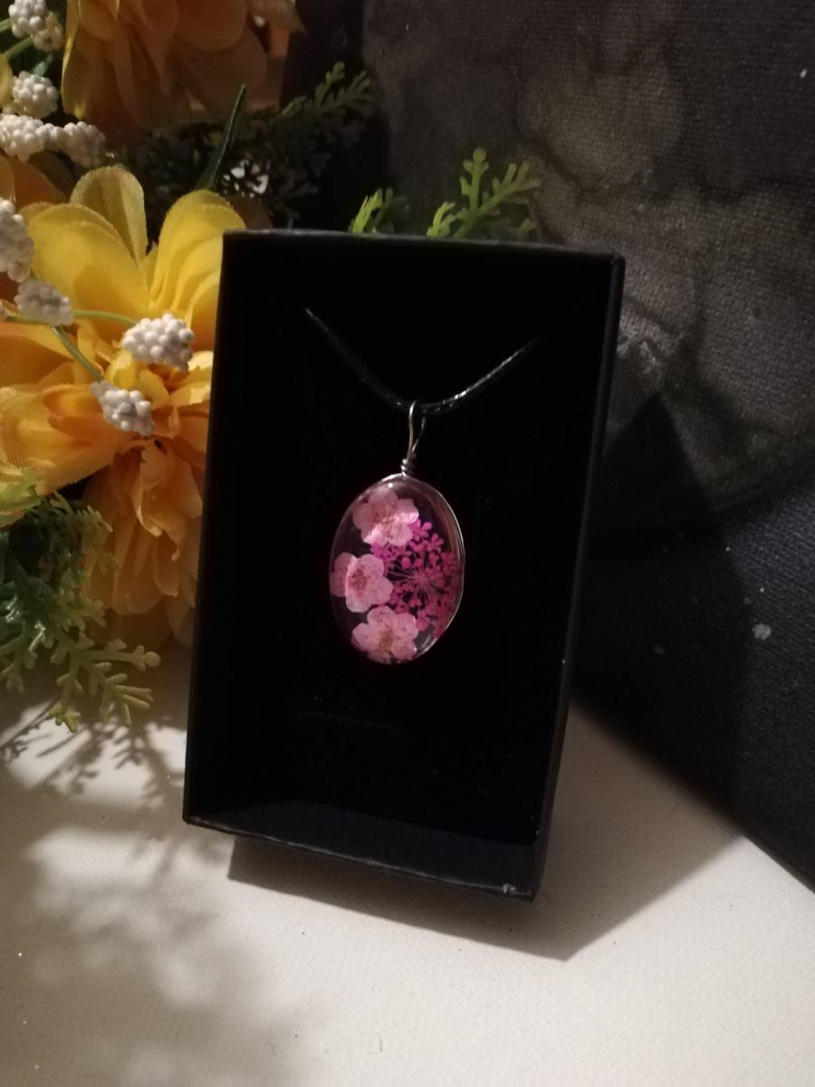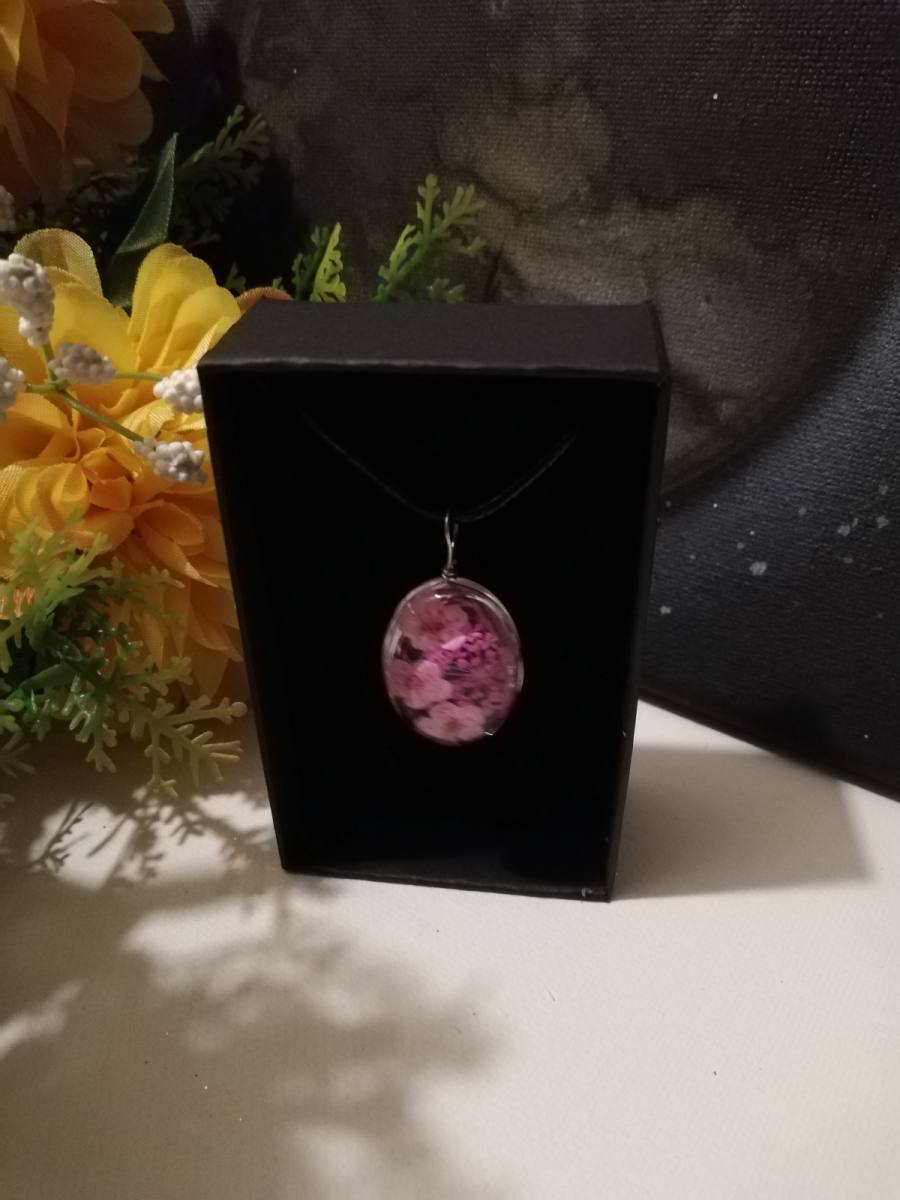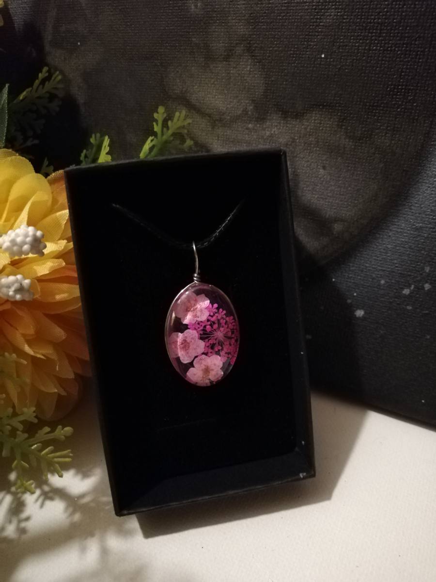 Osnova ogrlice je močna črna bombažna vrvica. Obesek je iz stekla-kristalne mase v kateri je vdelano suho prešano cvetje.
