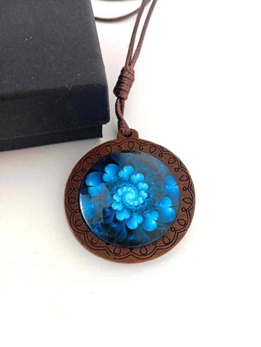 Osnova ogrlice je unikaten medaljon iz lesa.