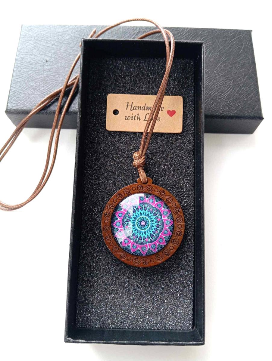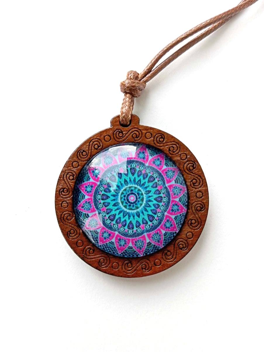 Večni Krog – Lesena Ogrlica z Mandalo je čudovit spoj naravnih elementov in duhovne simbolike, ki prinaša ravnovesje, harmonijo in globoko povezanost z naravo. Ta unikatna ogrlica je izdelana iz skrbno izbranega lesa, ki predstavlja moč in stabilnost, medtem ko je v središče vdelana steklena mandala, ki s svojo kompleksno geometrijo simbolizira večno cikličnost življenja in neprekinjen tok energije.