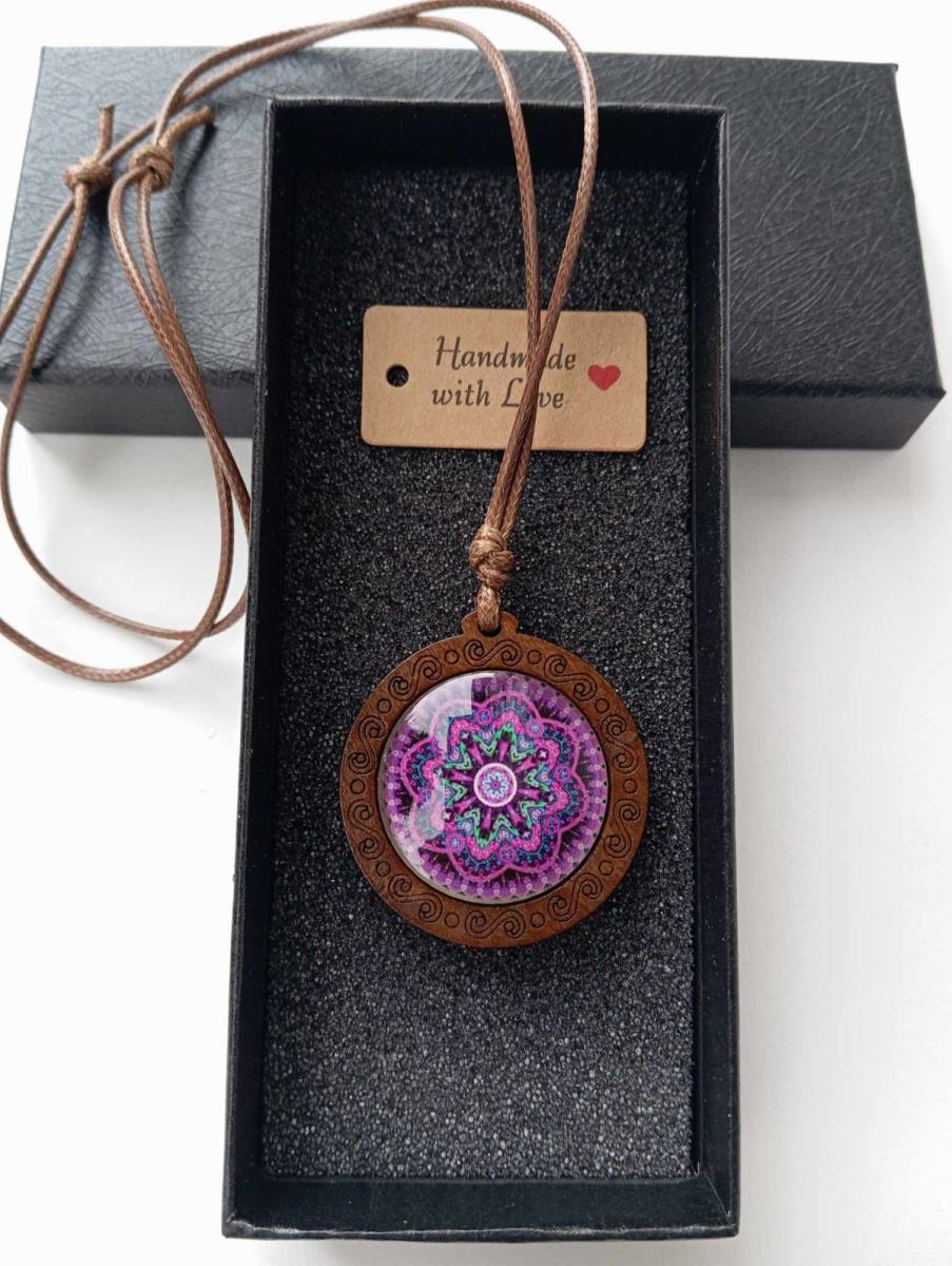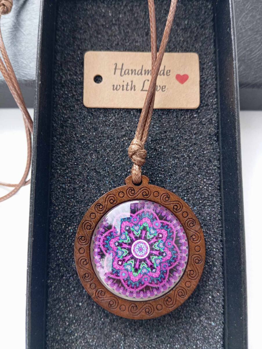 Večni Krog – Lesena Ogrlica z Mandalo je čudovit spoj naravnih elementov in duhovne simbolike, ki prinaša ravnovesje, harmonijo in globoko povezanost z naravo. Ta unikatna ogrlica je izdelana iz skrbno izbranega lesa, ki predstavlja moč in stabilnost, medtem ko je v središče vdelana steklena mandala, ki s svojo kompleksno geometrijo simbolizira večno cikličnost življenja in neprekinjen tok energije.