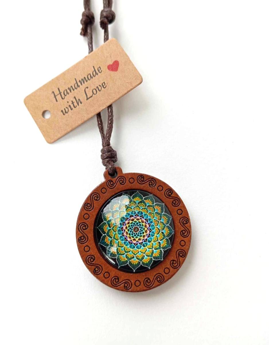 Večni Krog – Lesena Ogrlica z Mandalo je čudovit spoj naravnih elementov in duhovne simbolike, ki prinaša ravnovesje, harmonijo in globoko povezanost z naravo. Ta unikatna ogrlica je izdelana iz skrbno izbranega lesa, ki predstavlja moč in stabilnost, medtem ko je v središče vdelana steklena mandala, ki s svojo kompleksno geometrijo simbolizira večno cikličnost življenja in neprekinjen tok energije.