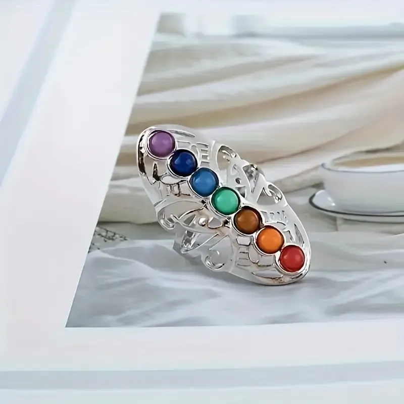 Prebudite svojo notranjo energijo s čudovitim prstanom, ki simbolizira sedem glavnih čaker – energetskih središč telesa, ki vplivajo na naše fizično, čustveno in duhovno počutje. Vsak kamen na tem elegantnem prstanu ustreza eni čakri in je skrbno izbran po barvi, ki odraža njen pomen in vibracijo.