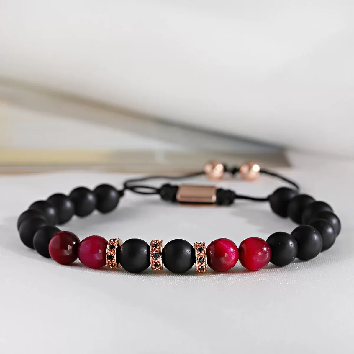 Ta zapestnica združuje dve mogočni, a izjemno nežni energiji – mat oniks, kamen zaščite in notranje stabilnosti, ter tigrovo oko, kristal jasnosti, modrosti in poguma. Skupaj ustvarjata talisman, ki deluje kot tih, zaupanja vreden spremljevalec skozi izzive, spremembe in trenutke, ko si želimo več trdnosti ter miru v sebi.