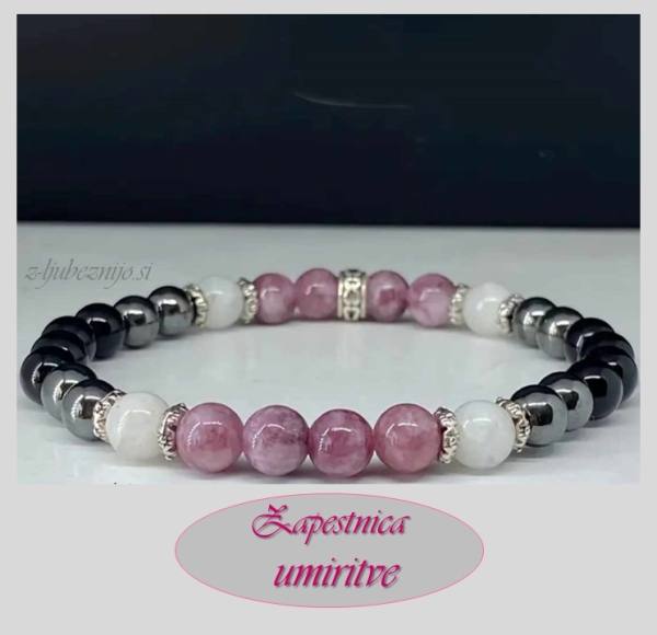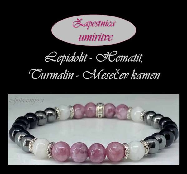 "Zapestnica umiritve" - Lepidolit, Hematit, Obsidian, Mesečev kamen