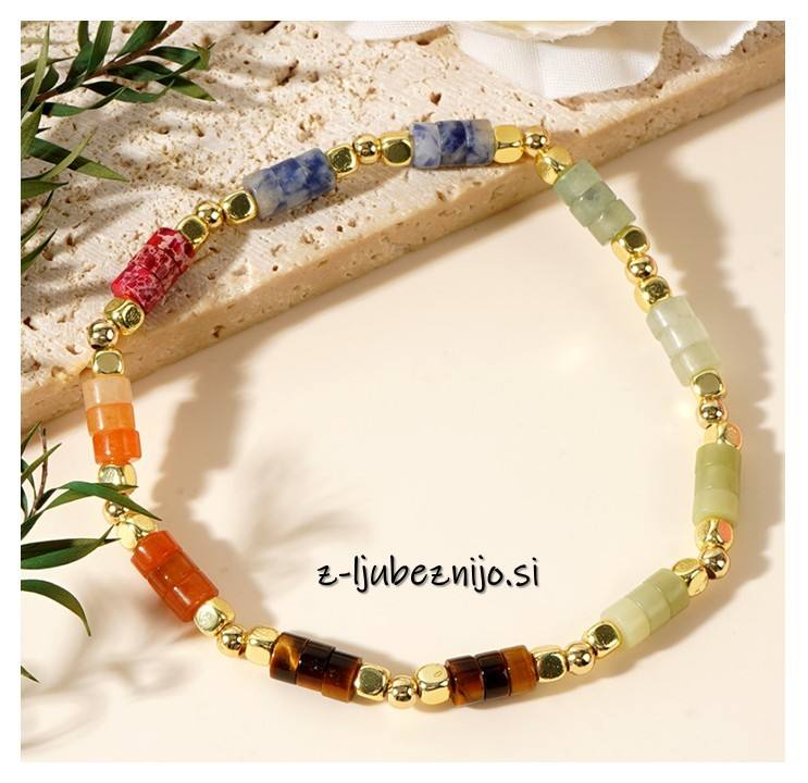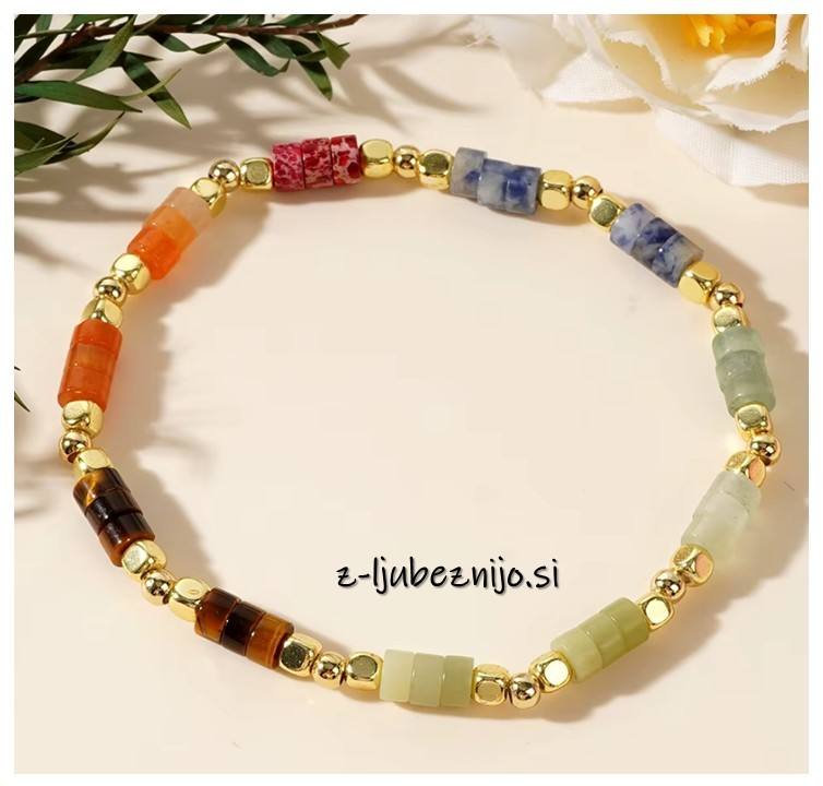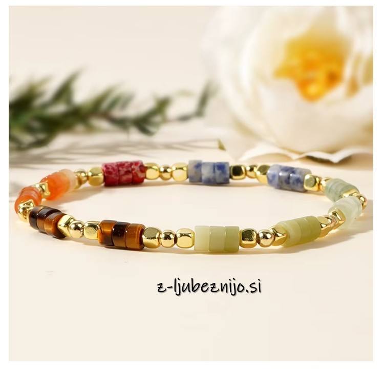Zapestnica je sestavljena iz skrbno izbranih kamnov različnih barv, ki skupaj ustvarjajo pretok svetlobe, topline in nežne moči. Rdeči ton prebuja moč in stabilnost, oranžni spodbuja ustvarjalnost in veselje, zlato-rjavi prinaša samozavest in jasnost, zeleni širi ljubezen in notranji mir, modri odpira komunikacijo in izražanje resnice, indigo krepi intuicijo, medtem ko vijolični dviguje zavest in povezuje z višjimi ravnmi duha.