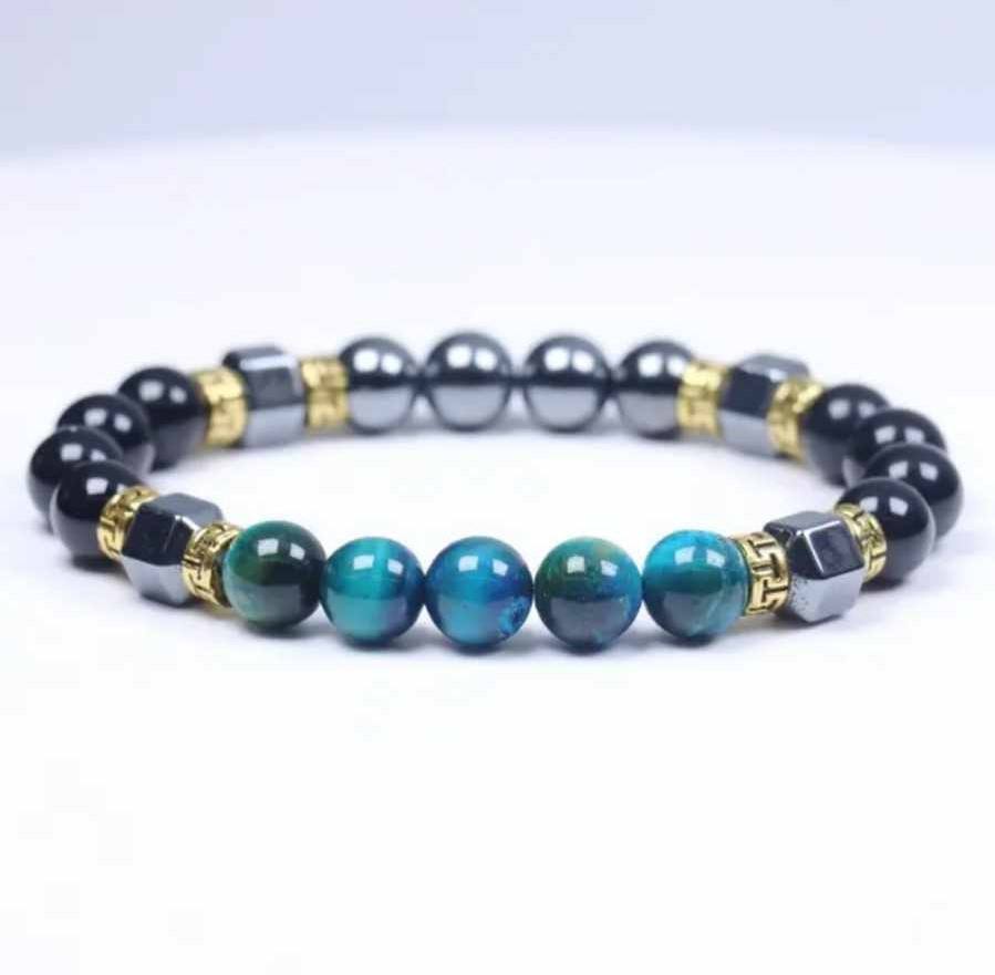 V teh zapestnicah se srečujejo tri močne energije. Barvno tigrovo ali mačje oko deluje kot energijski prevodnik, ki nežno odpira specifične čustvene tokove in notranje uvidenje. Obsidian je zaščitnik – močan, temen kamen, ki deluje kot ogledalo resnice in hkrati kot ščit pred zunanjimi vplivi. Hematit pa prinaša globoko stabilnost in prizemljitev, usmerja tvojo energijo navznoter in ti pomaga ohranjati jasnost tudi v čustvenem kaosu.