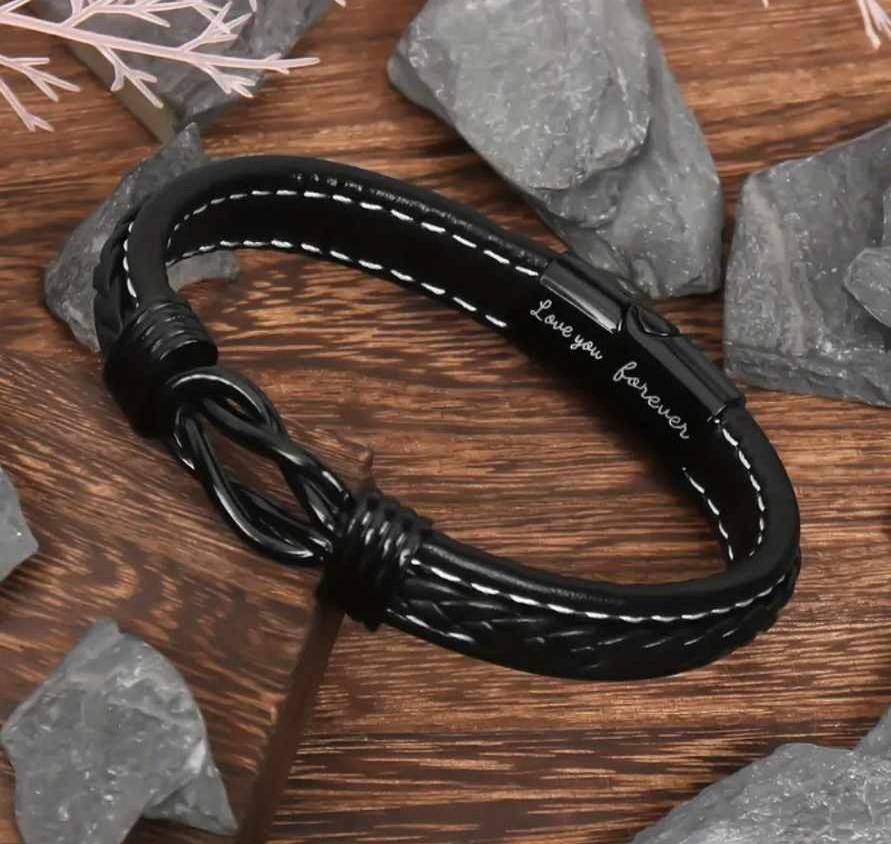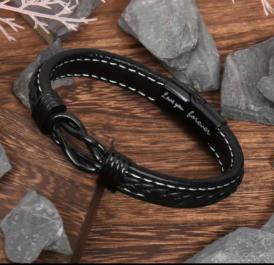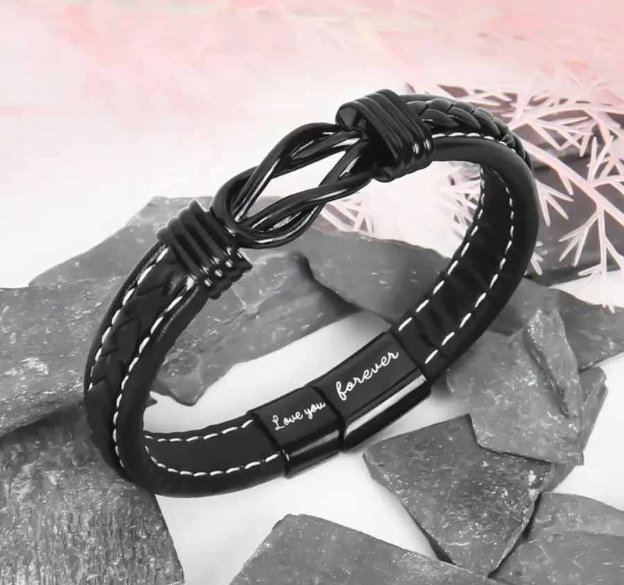 Zapestnica je izdelana iz visokokakovostnega pletenega usnja in nerjavečega jekla, kar ji daje eleganten, a močan videz. Je brezčasen kos, ki se odlično poda k vsakemu slogu – od vsakodnevnega do elegantnega. Na notranji strani zapestnice je diskretno vgravirano sporočilo "Love you forever", ki nosi dodaten pomen in osebno noto.
