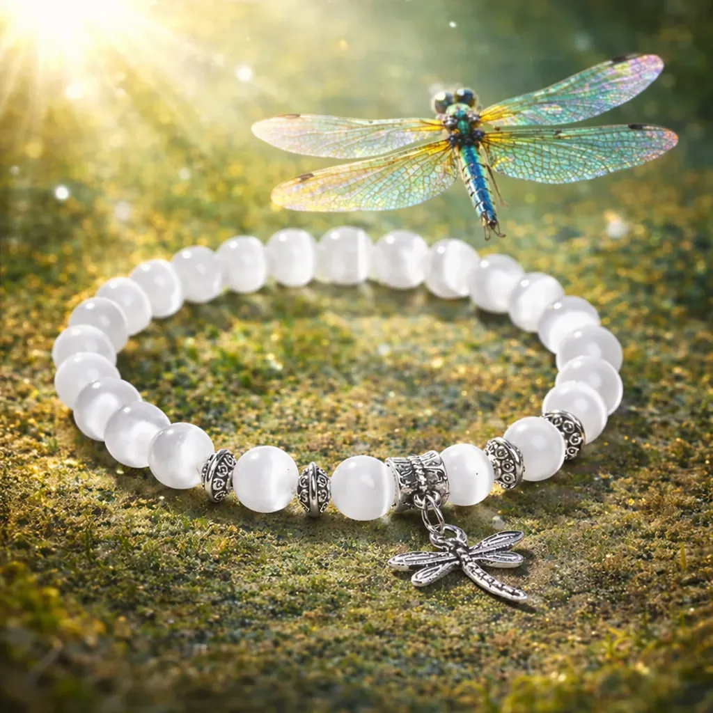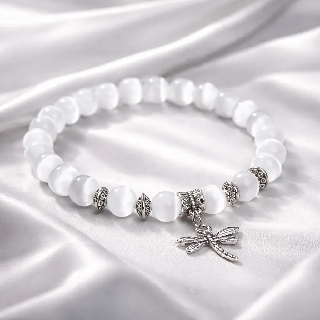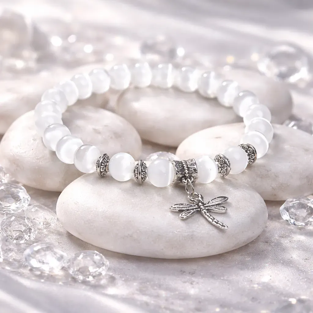 Selenit, znan kot angelski kristal, v to zapestnico prinaša svetlobo in zaščito. Njegova čista, visoka vibracija čisti energijo, umirja misli in ustvarja prostor, kjer se lahko ponovno povežemo s svojo notranjo modrostjo. Že od nekdaj je veljal za kamen miru, duhovnega vodstva in nežne, a močne podpore.