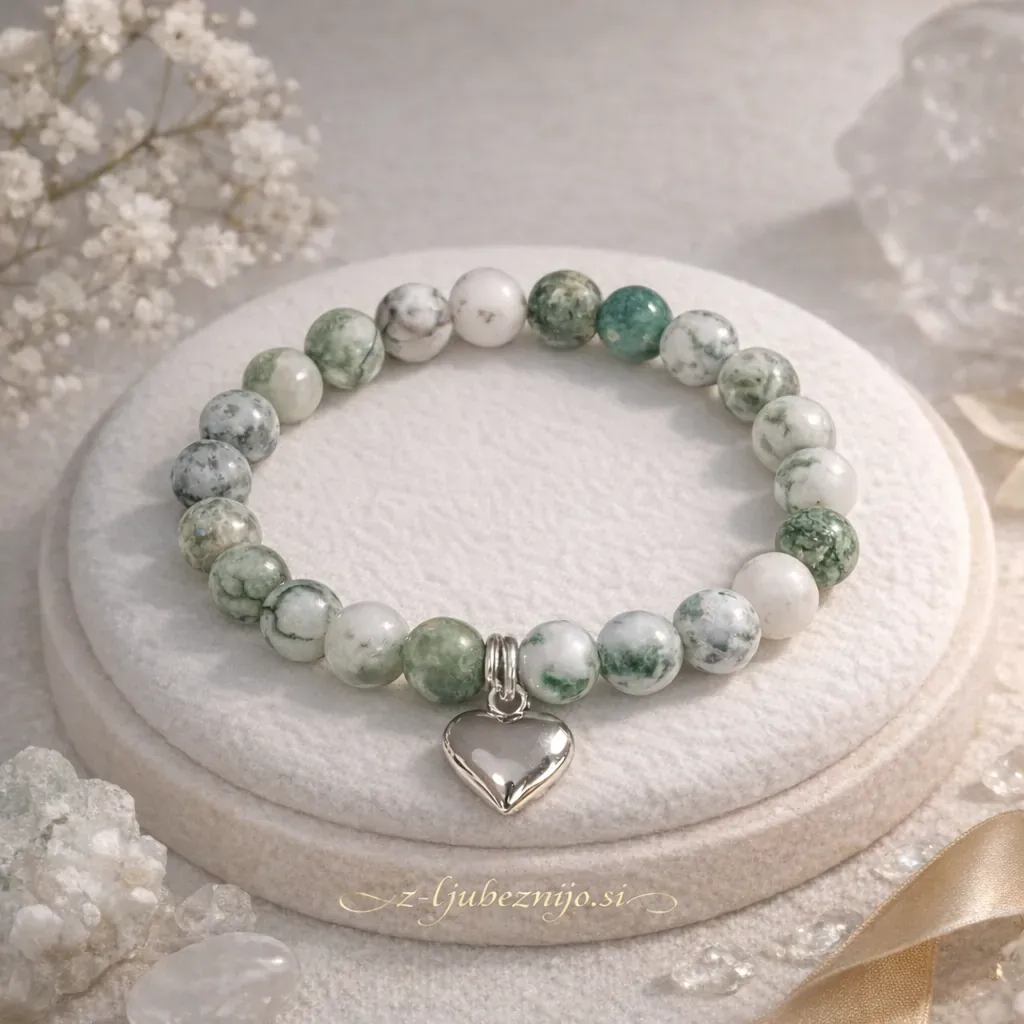 Zapestnica Amoria nosi v sebi nežnost, mir in toplino. Njeni mehki beli in zeleni odtenki ustvarjajo občutek ravnovesja ter spominjajo na svežino narave, tišino jutra in lahkotnost novih začetkov. V središču zapestnice se nežno zasveti droben srček – simbol ljubezni, povezanosti in pozornosti do sebe.