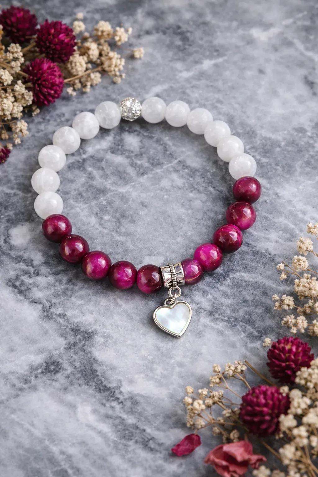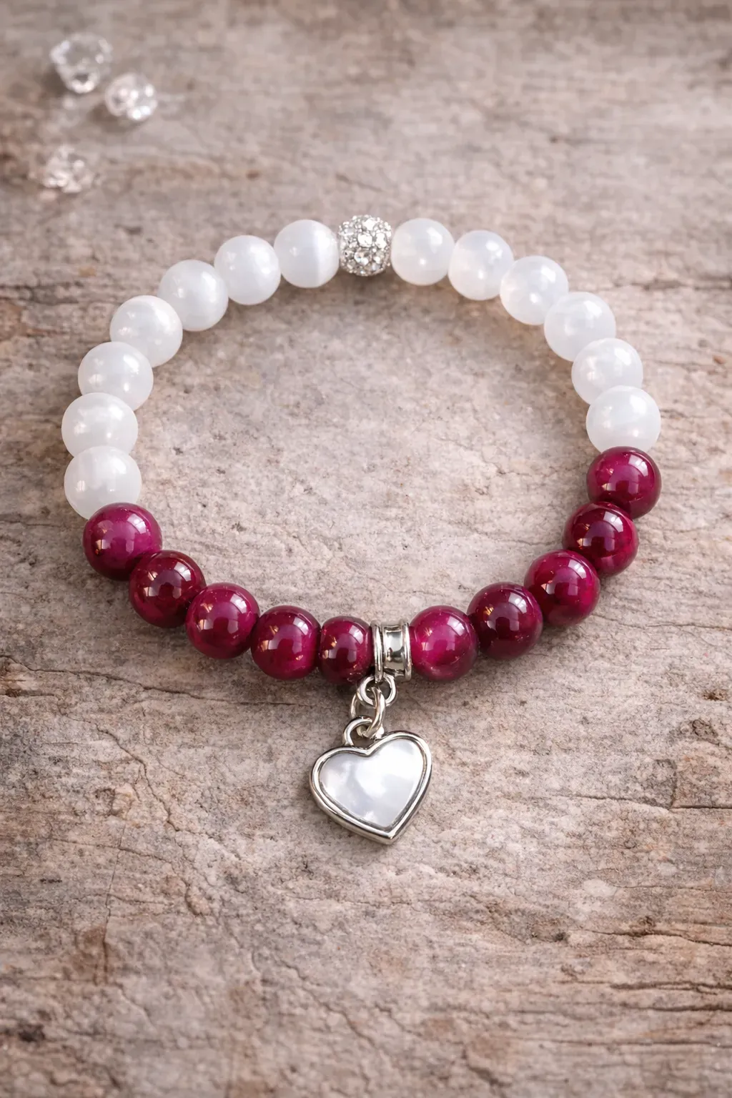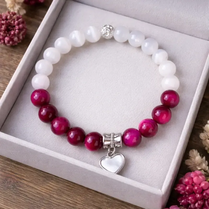 Zapestnica Čista ljubezen – selenit, mačje viola oko in srčni simbol