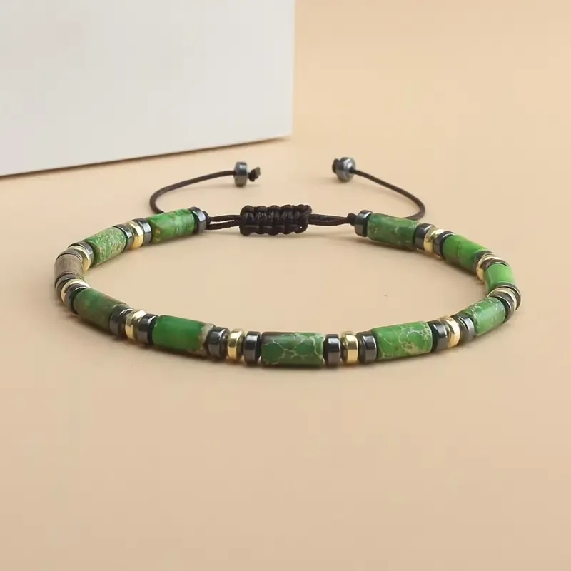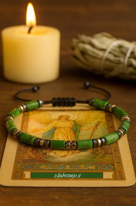 Zapestnica “Urok odpuščanja” je ustvarjena iz afriškega turkiza in hematita, kristalov, ki v popolnem ravnovesju združujeta moč zdravljenja in zaščite. Afriški turkiz, znan kot kamen preobrazbe, nežno odpira srčno čakro, zdravi čustvene rane in pomaga spustiti vse, kar ne služi več tvoji poti. Hematit s svojo zaščitno energijo skrbi, da je ta proces mehak, varen in prizemljen, medtem ko zlat poudarek simbolizira svetlobo, ki pride, ko odpustimo.