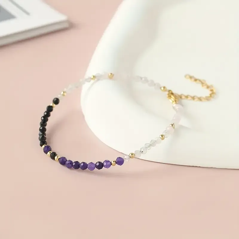 Ta prefinjena zapestnica združuje naravne fasetirane kristale ametista, obsidiana, roževca in kamene strele, ki skupaj ustvarjajo uravnoteženo energijsko kombinacijo zaščite, miru in ljubezni. Zlati vmesniki ji dodajo eleganco in pridih razkošja.
