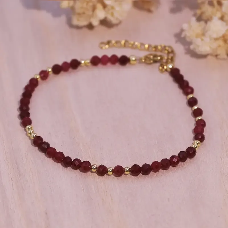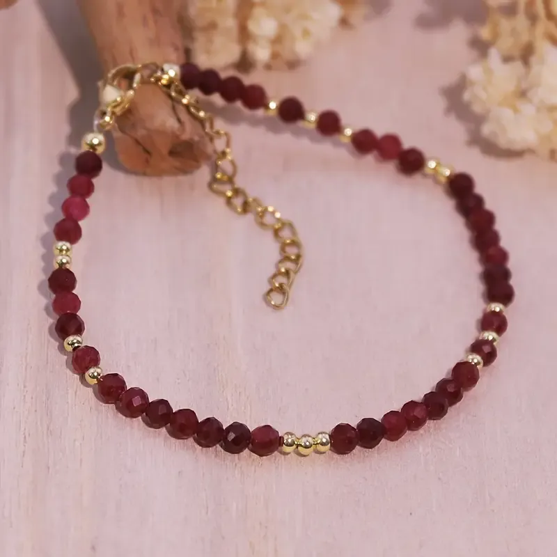 Zaradi svojih toplih odtenkov rdeče in elegantnih zlatih vmesnikov, ta zapestnica ni le energijsko močna, temveč tudi estetsko izjemno dovršena.