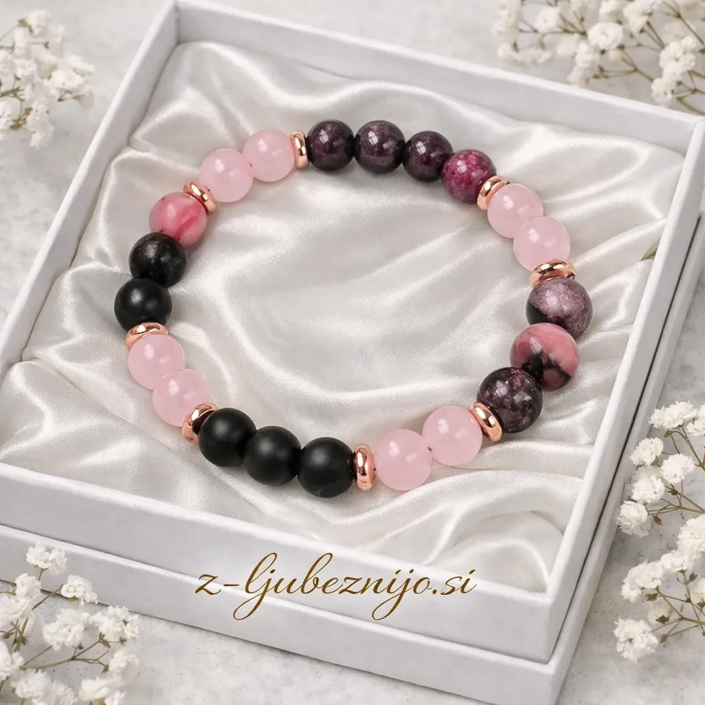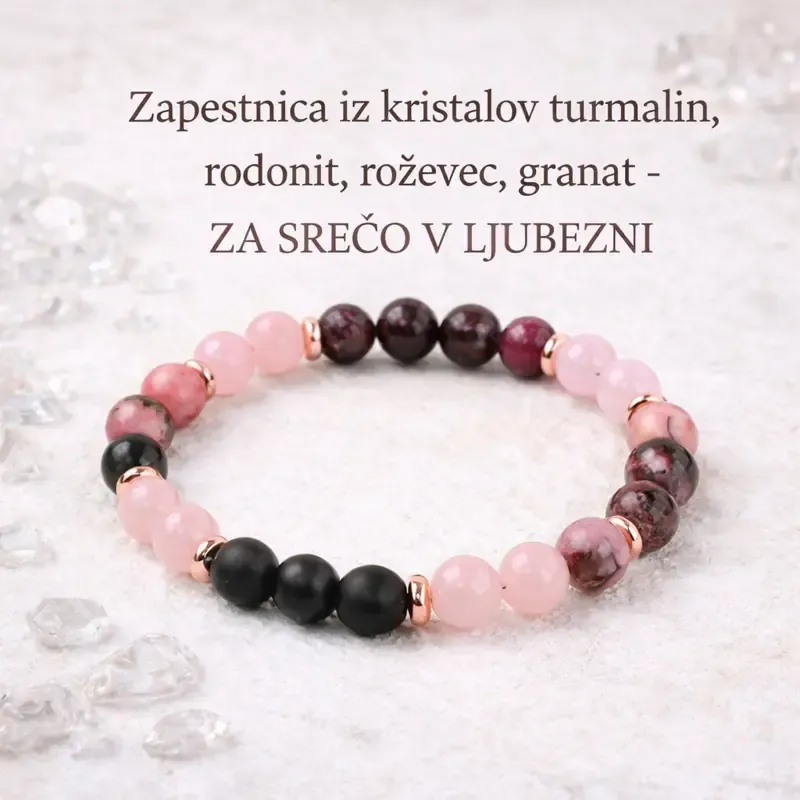 Ljubezen je najmočnejša sila v vesolju – toplina, ki zdravi, povezuje in prinaša srečo. Vendar je prava ljubezen tista, ki najprej zacveti v tebi samem. Ta zapestnica, spletena iz turmalina, rodonita, granata in roževca, je ustvarjena za srčno energijo – za privabljanje ljubezni, zdravljenje ran preteklosti in negovanje nežnosti v sebi ter drugih.