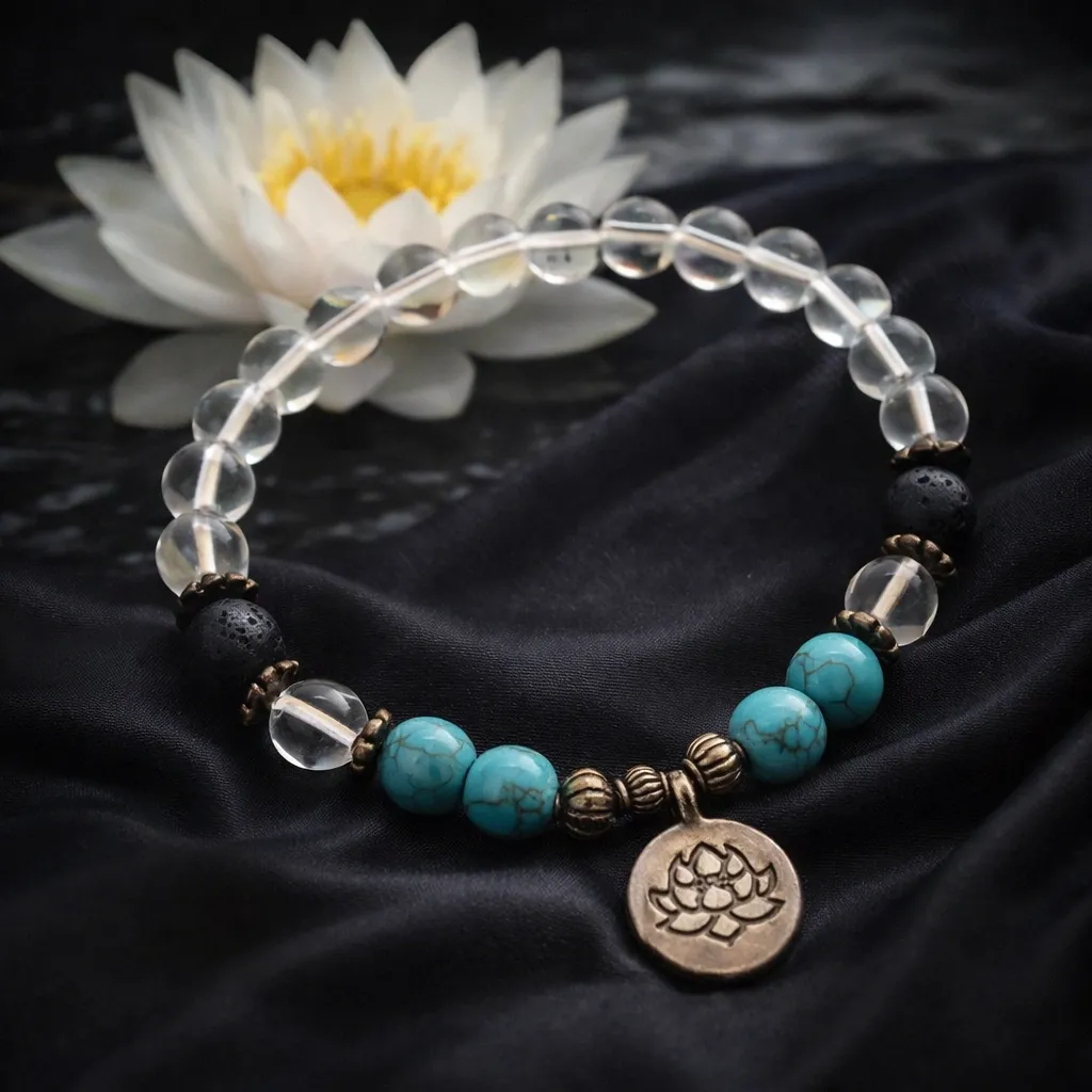 Zapestnica je skrbno sestavljena iz turkiza, kamene strele (gorskega kristala) in lave, kristalov, ki se med seboj dopolnjujejo in ustvarjajo harmonično celoto. Turkiz simbolizira zaščito, modrost in notranjo resnico ter nas nežno podpira pri izražanju sebe. Kamena strela, znana kot mojster jasnosti in ravnovesja, pomaga čistiti misli ter ojača namen in energijo drugih kamnov. Lava, rojena iz ognja in globin Zemlje, predstavlja moč, stabilnost in prizemljenost – opominja nas, da tudi iz najbolj burnih procesov lahko nastane trdna in lepa oblika.