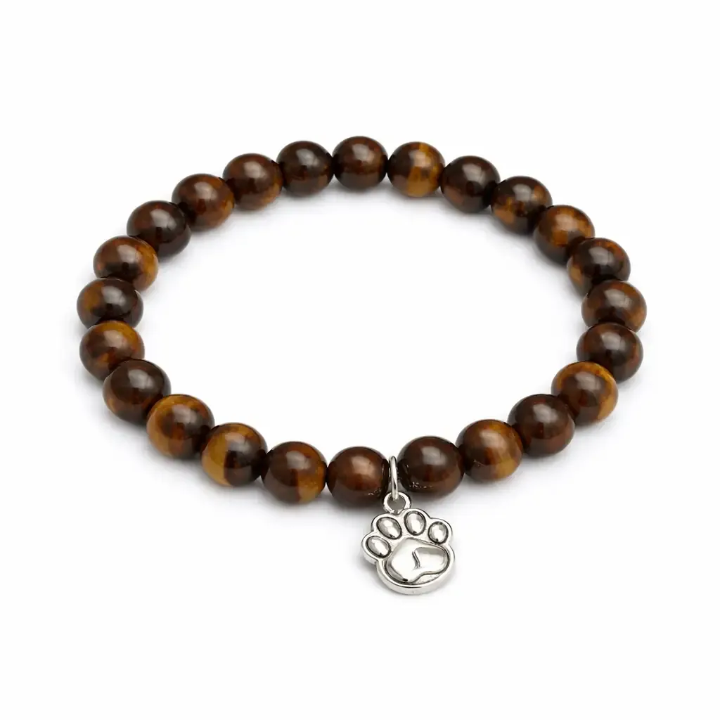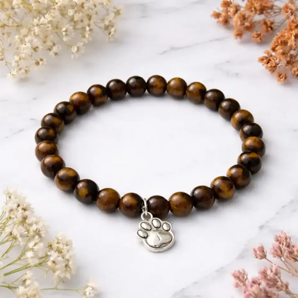 Topli rjavi toni kroglic spominjajo na naravne kamne, kot je tigrovo oko, in ustvarjajo občutek povezanosti z zemljo, naravo in notranjim ravnovesjem. Srebrna tačka v središču zapestnice simbolizira zaščito, zvestobo in večno vez med človekom in živaljo – vez, ki ostane tudi takrat, ko so besede odveč.