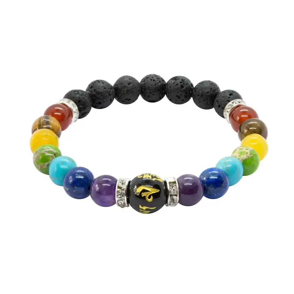 Zapestnica "Moč sedmih energij" je prefinjena kombinacija kamnov, ki ponazarjajo sedem glavnih čaker in lave, ki predstavlja moč in stabilnost zemlje. Ta zapestnica ne le krasi, temveč tudi deluje kot močan energetski pripomoček za vzpostavljanje ravnovesja in harmonije v telesu in duhu.