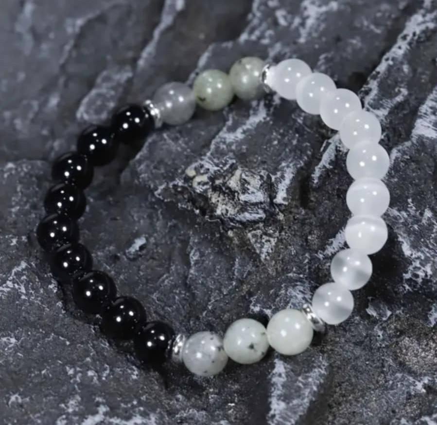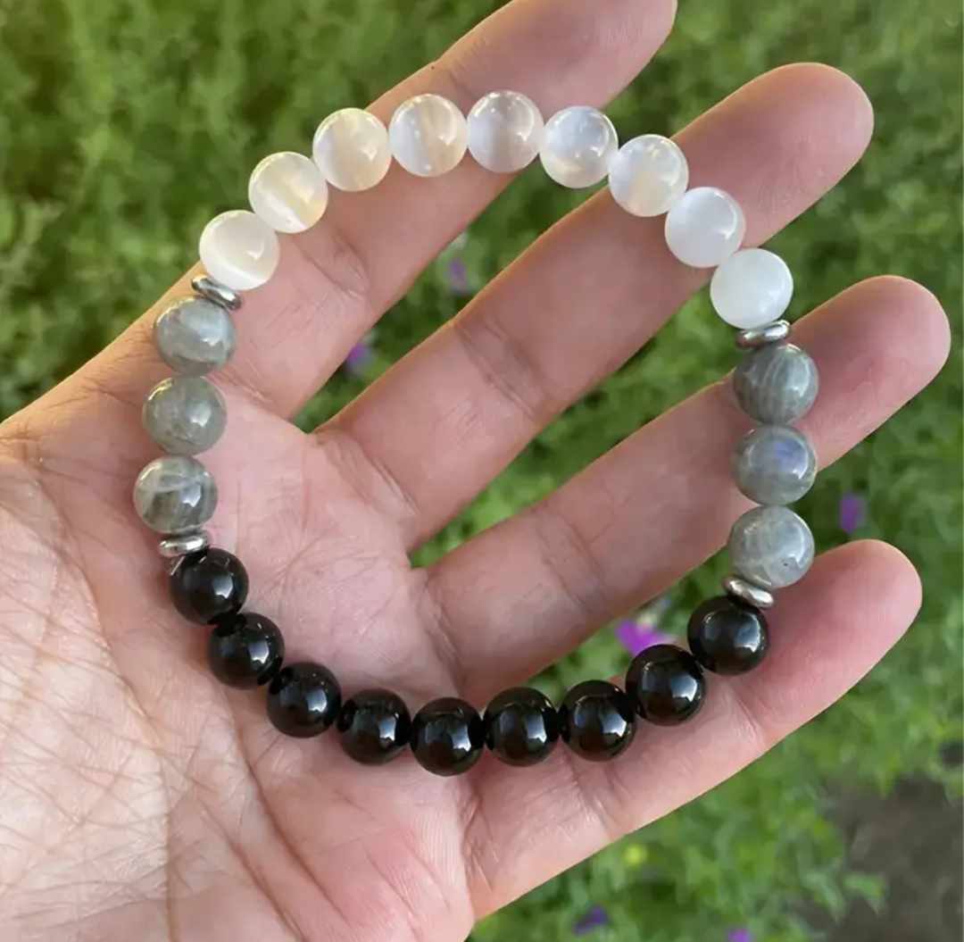 Zapestnica Most med svetovi je energetski talisman, ki simbolizira povezavo med tem svetom, v katerem živimo, in svetovi, iz katerih smo prišli ter kamor se bomo nekoč vrnili. Vsak kristal, ki sestavlja to zapestnico, nosi globoko simboliko prehoda, večnosti in duhovne povezanosti z dimenzijami onkraj vidnega.