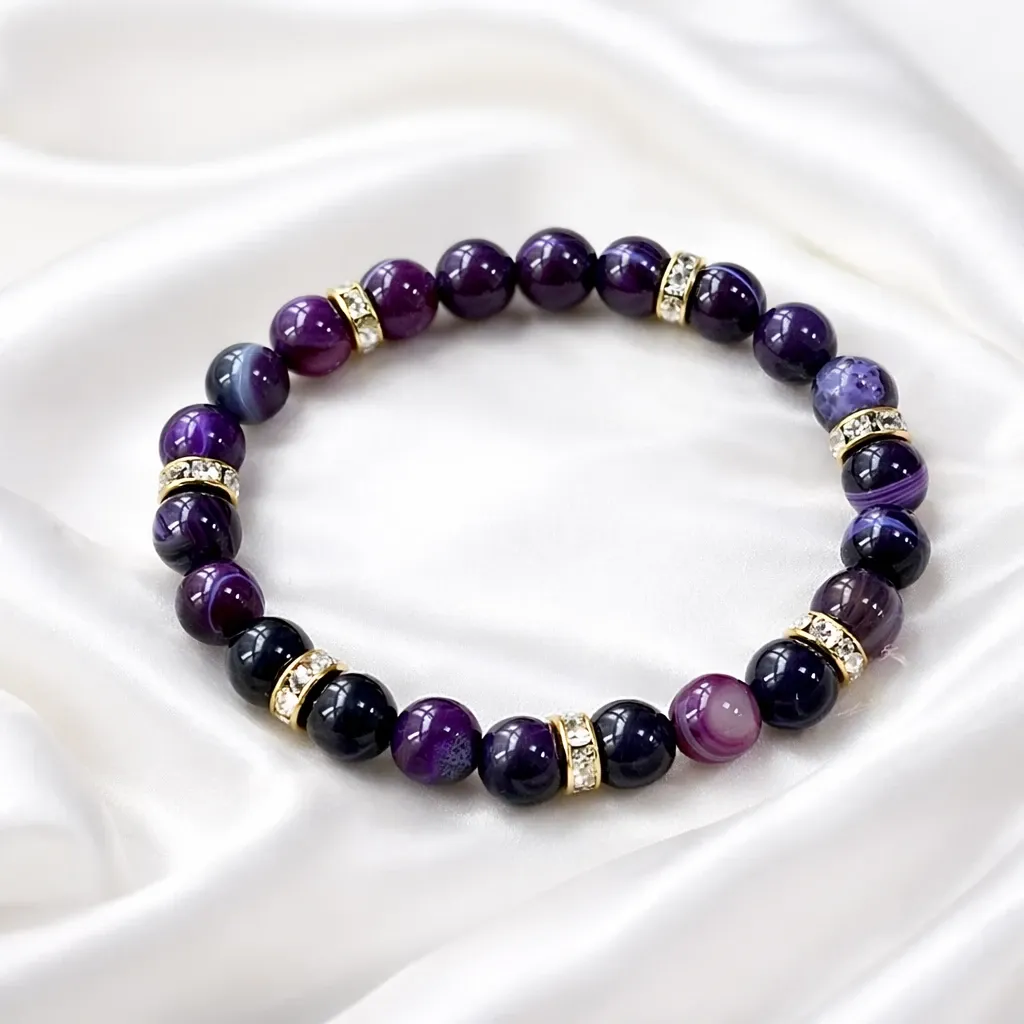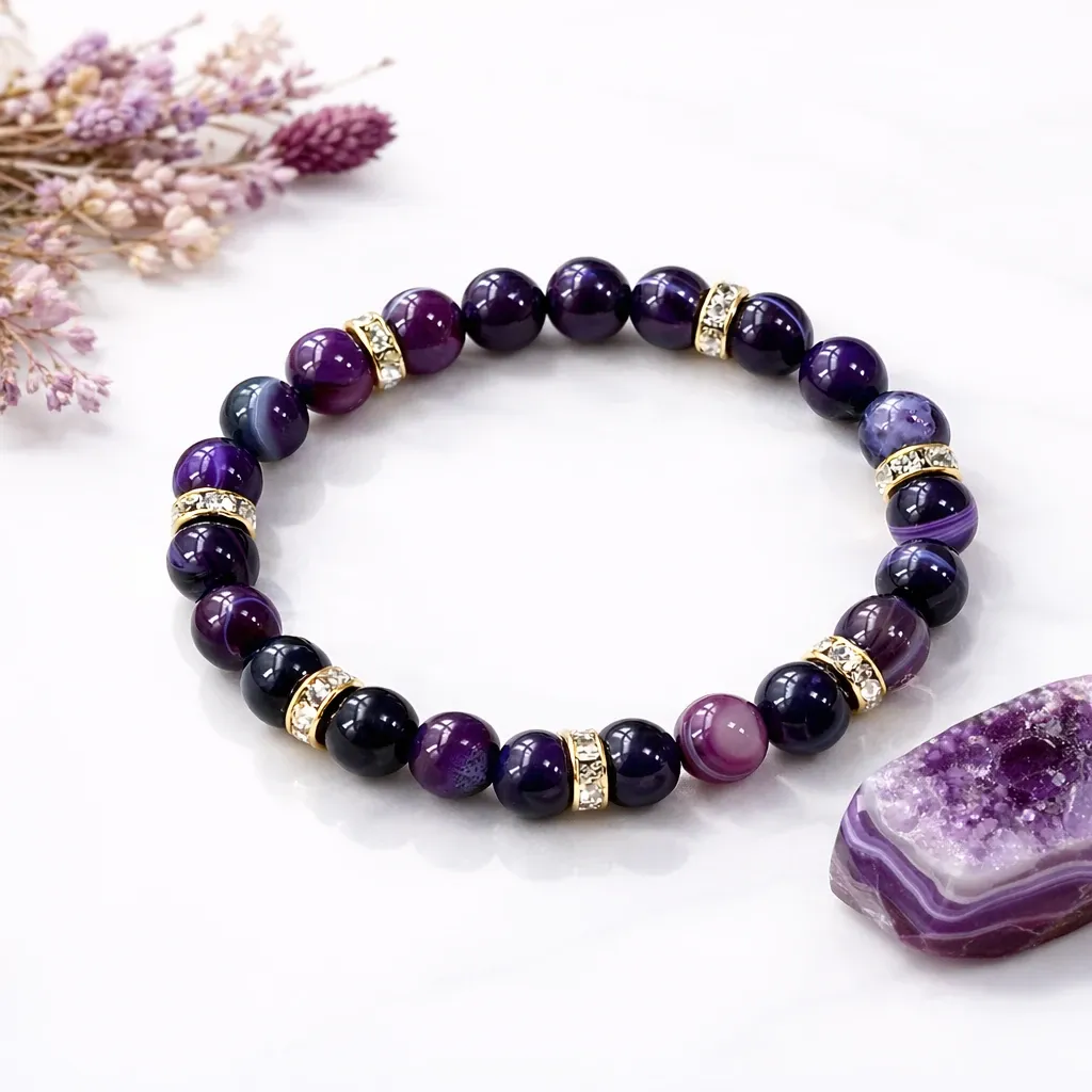 Osrednji kamen zapestnice je viola ahat, znan po svoji umirjajoči in stabilizirajoči energiji. Njegovi mehki vijolični odtenki simbolizirajo notranji mir, zaščito in čustveno ravnovesje. Viola ahat podpira občutek varnosti, pomaga prizemljiti razpršene misli ter spodbuja nežno povezavo s sabo – brez pritiska, brez hitenja.