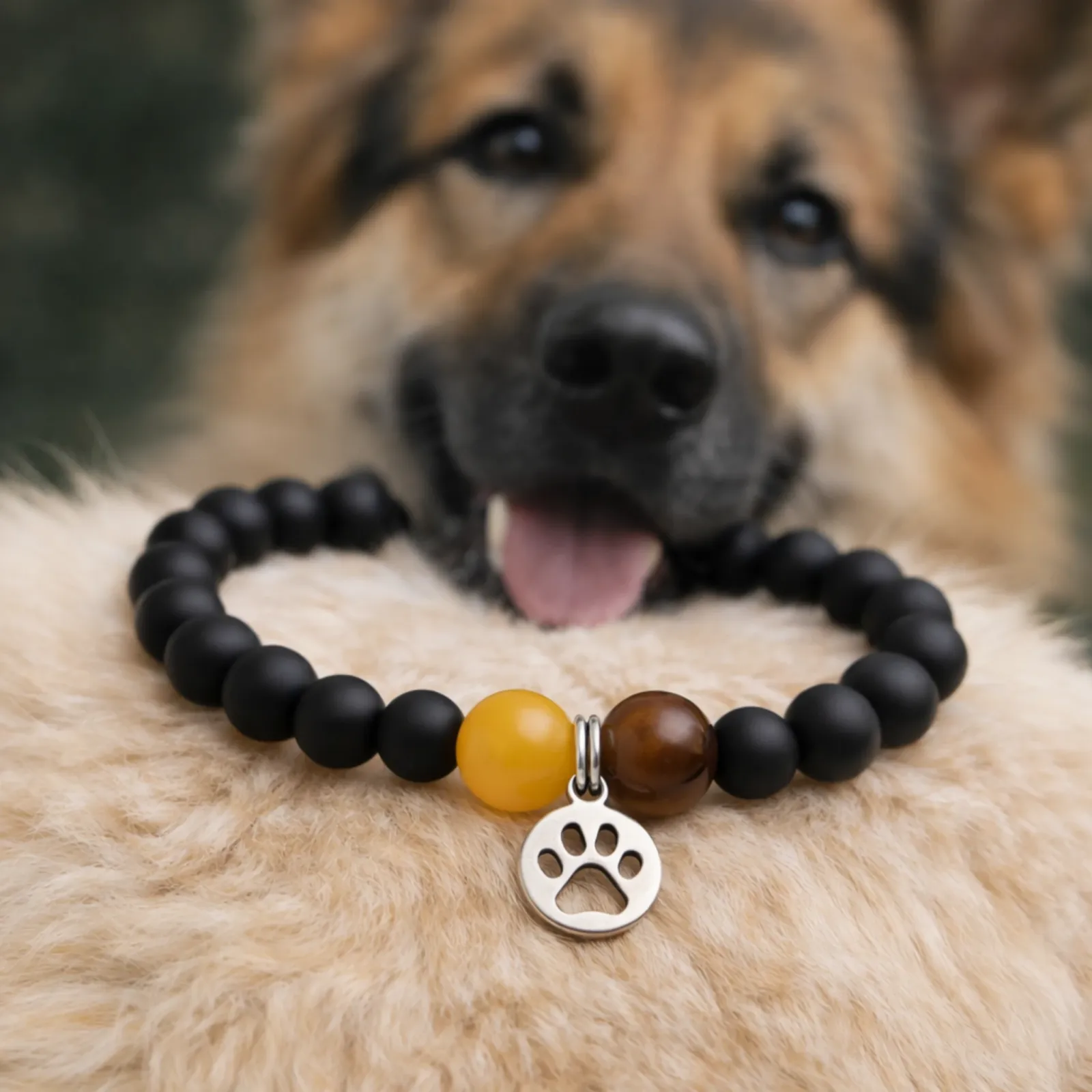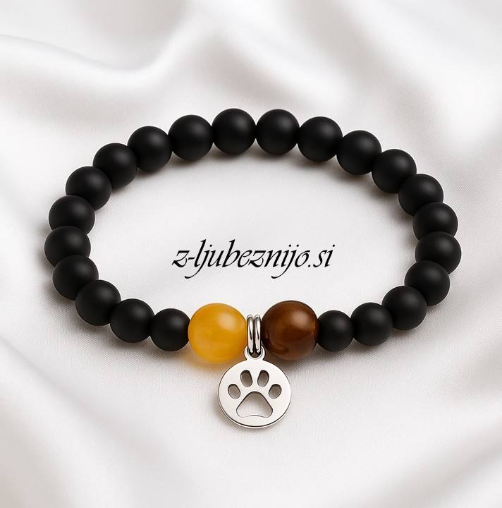 Oniks, ki tvori osnovo zapestnice, prinaša stabilnost, notranjo moč in mir. Njegova temna eleganca je kot tiho srce, ki bije zvesto in neomajno – tako kot srce živali, ki nas ljubi brez meja.