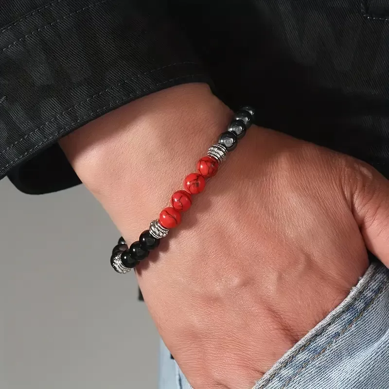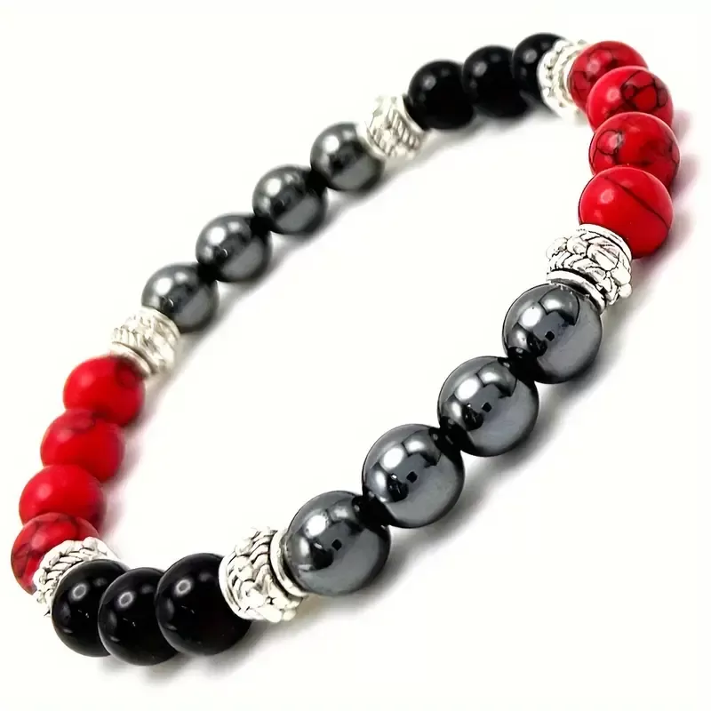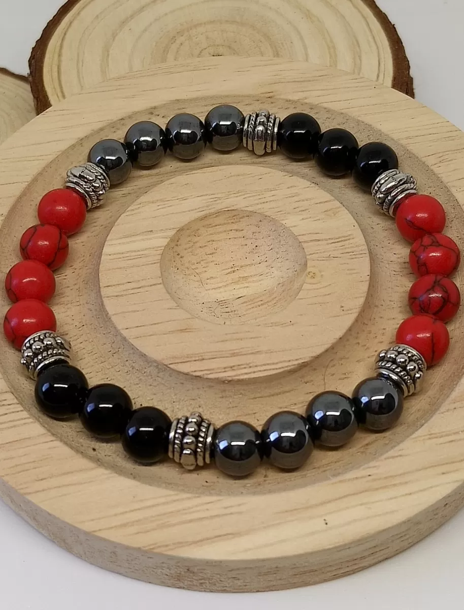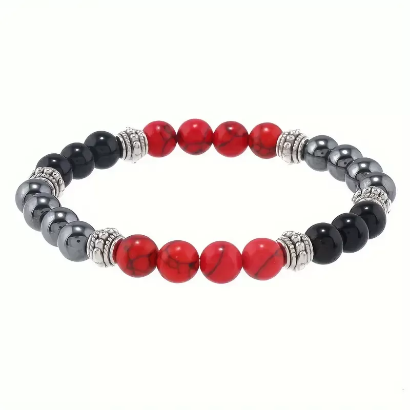 Rdeči turkiz prinaša energijo strasti, topline in odločnosti. S svojo izrazito rdečo barvo predstavlja ogenj ljubezni, ki nas spodbuja k izražanju in poglobljenemu doživljanju čustev. Rdeči turkiz v zapestnici krepi vašo samozavest in spodbuja pozitivno energijo, kar pritegne ljubezen in srečo v vaše življenje. Njegova vibracija je optimistična, vesela in spodbuja radostno doživljanje ljubezenskih trenutkov.