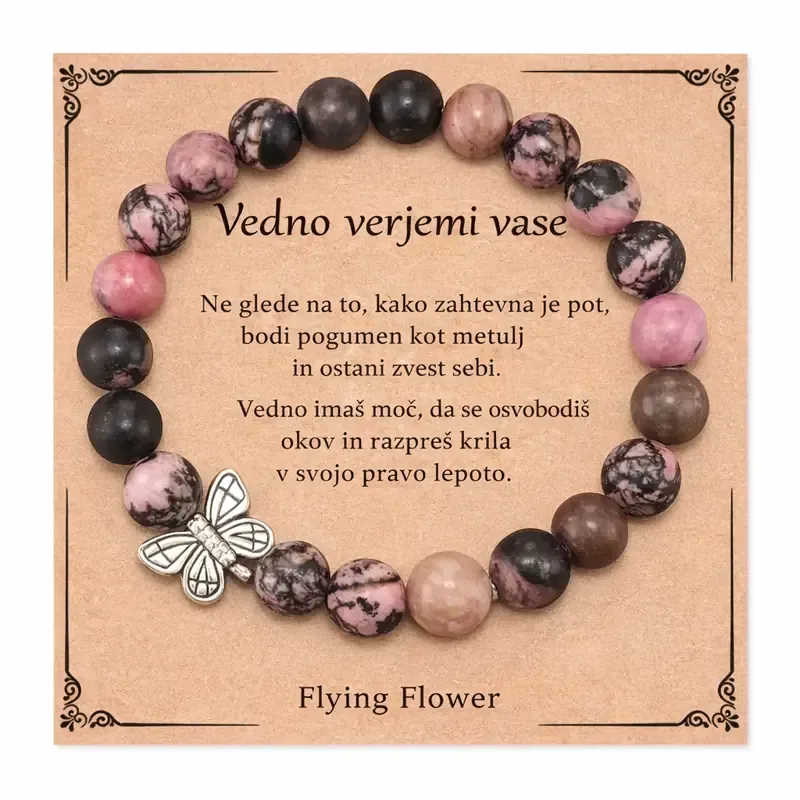 Zapestnica "Verjemi vase in svojo moč" je simbol notranje preobrazbe in moči, ki jo nosimo globoko v sebi, tudi takrat, ko je ne prepoznamo takoj. Ta prelepa zapestnica, izdelana iz kamnov v imitaciji rodonita, nas nežno opominja, da je naša notranja moč vedno prisotna, tudi v trenutkih, ko se počutimo negotove, ranljive ali dvomimo vase.