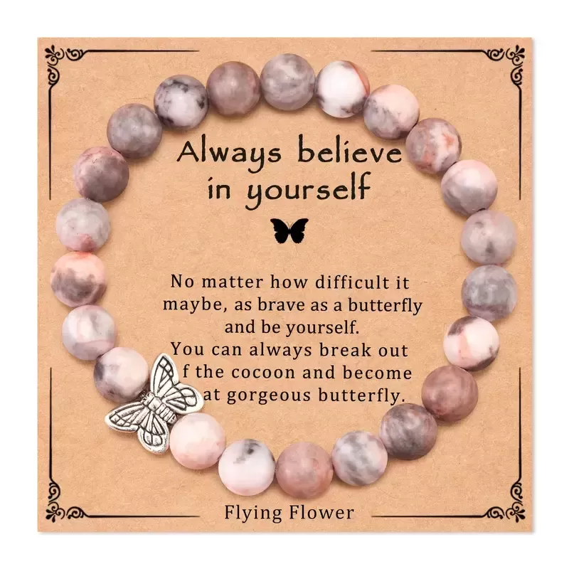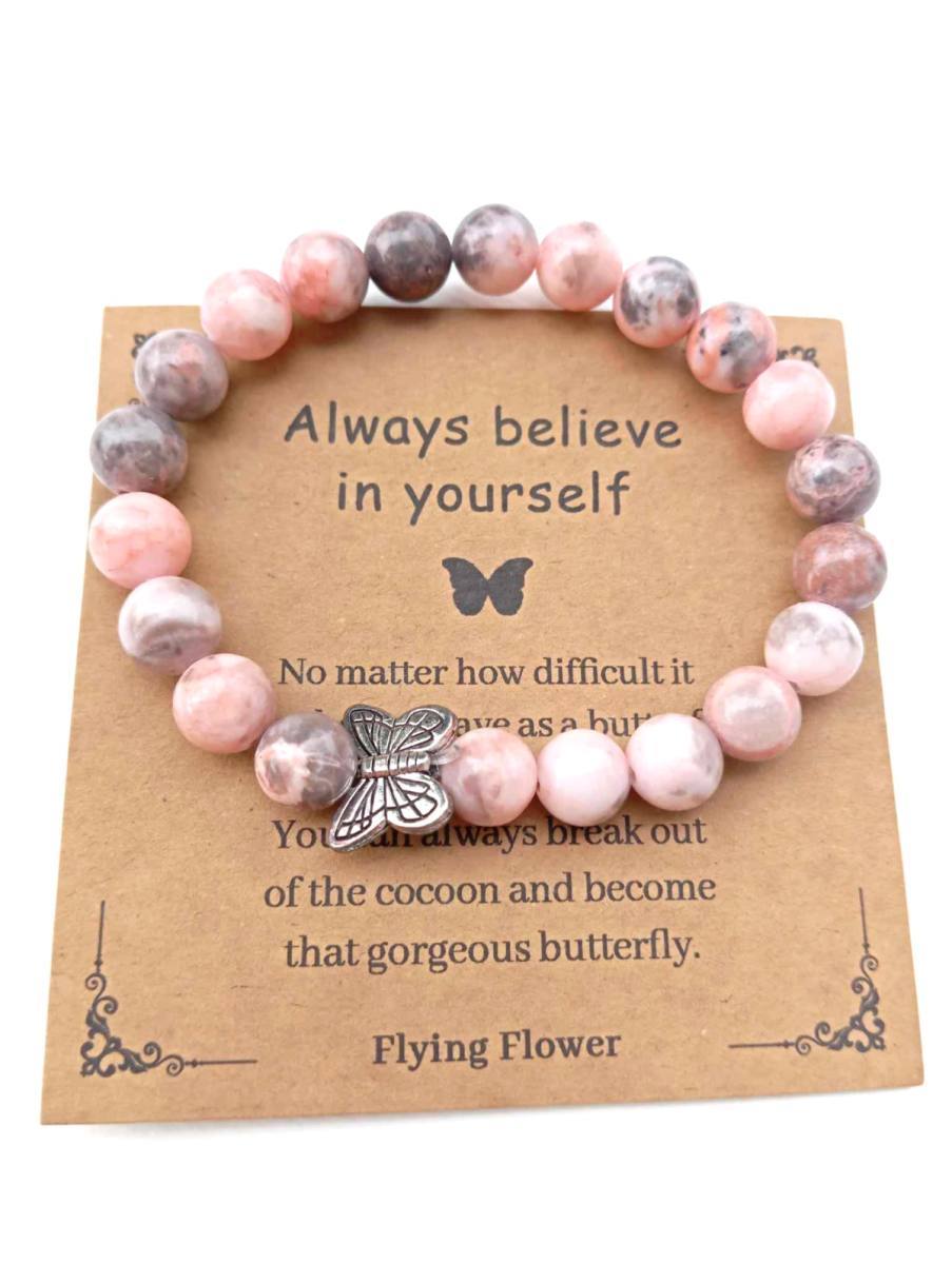 Zapestnica "Verjemi vase in svojo moč" je simbol notranje preobrazbe in moči, ki jo nosimo globoko v sebi, tudi takrat, ko je ne prepoznamo takoj. Ta prelepa zapestnica, izdelana iz kamnov v imitaciji rodonita, nas nežno opominja, da je naša notranja moč vedno prisotna, tudi v trenutkih, ko se počutimo negotove, ranljive ali dvomimo vase.