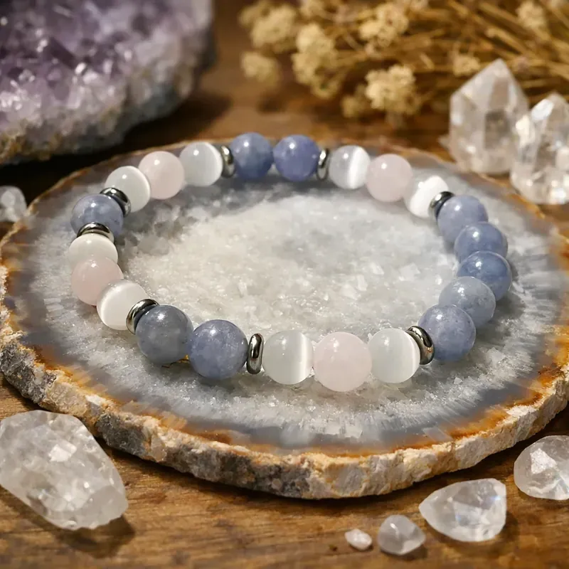 Zapestnica za Pogum je ročno izdelan energijski nakit, ki združuje moč treh nežnih, a izjemno močnih kristalov: roževca, akvamarina in selenita. Namenjena je vsem, ki si želijo več samozavesti, notranjega miru in srčne jasnosti pri premagovanju življenjskih izzivov.
