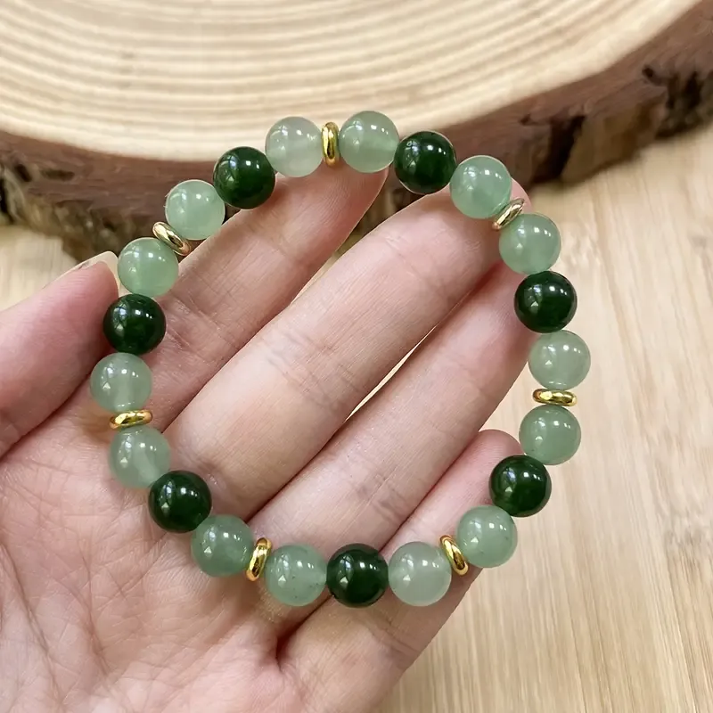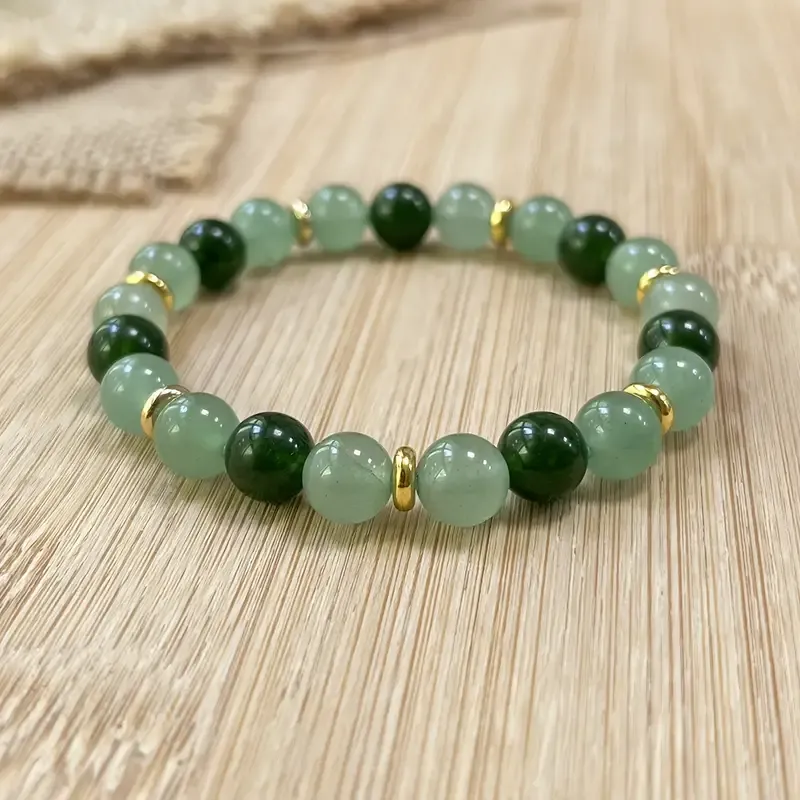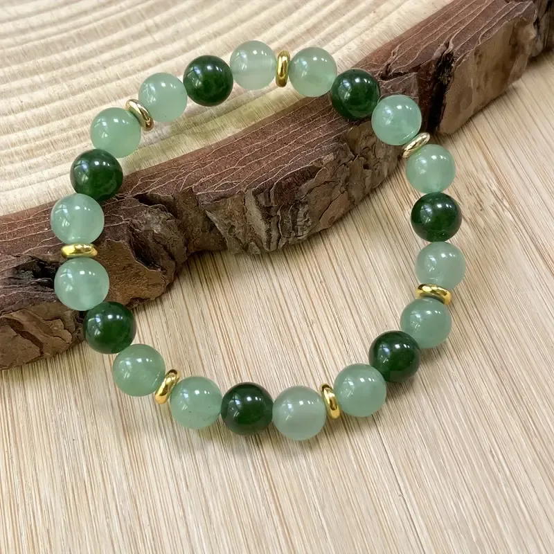 Ta zapestnica je popolna izbira za vse, ki si želite v svoje življenje pritegniti več sreče, blagostanja in notranjega ravnovesja. Kombinacija zelenega aventurina in nefrita, dopolnjena z elegantnimi zlatimi detajli, ni le estetsko dovršena, temveč ima tudi močno energetsko vrednost.