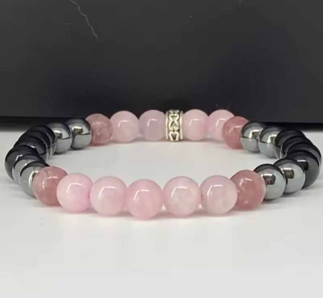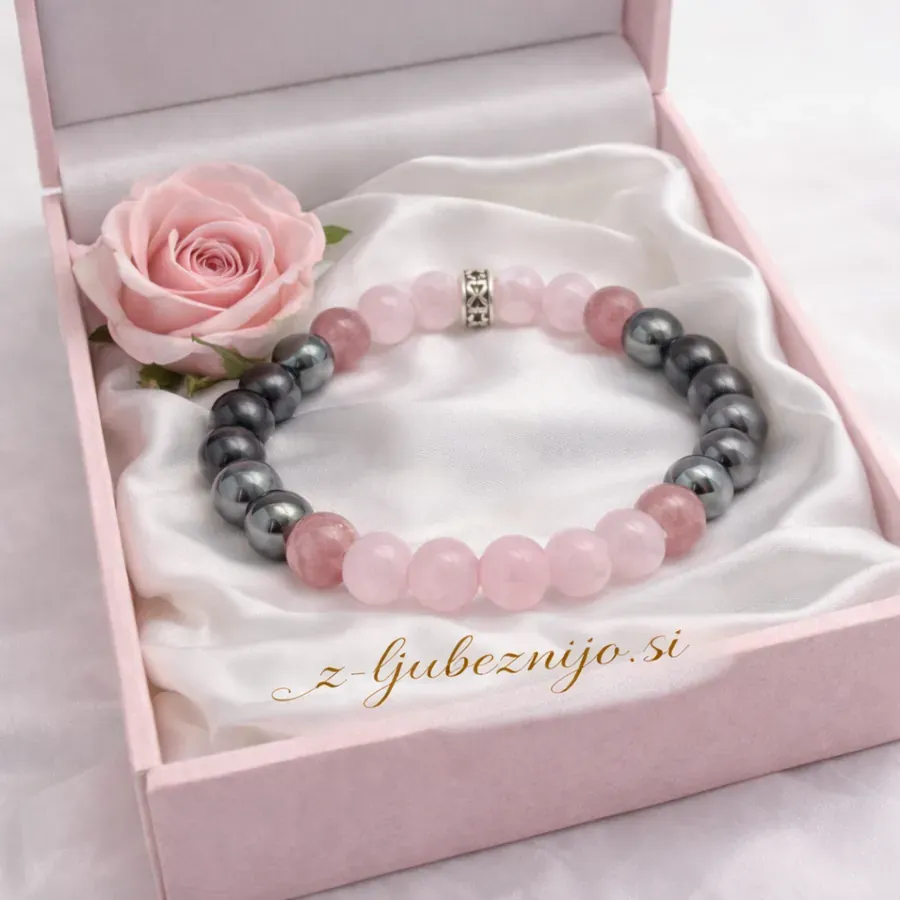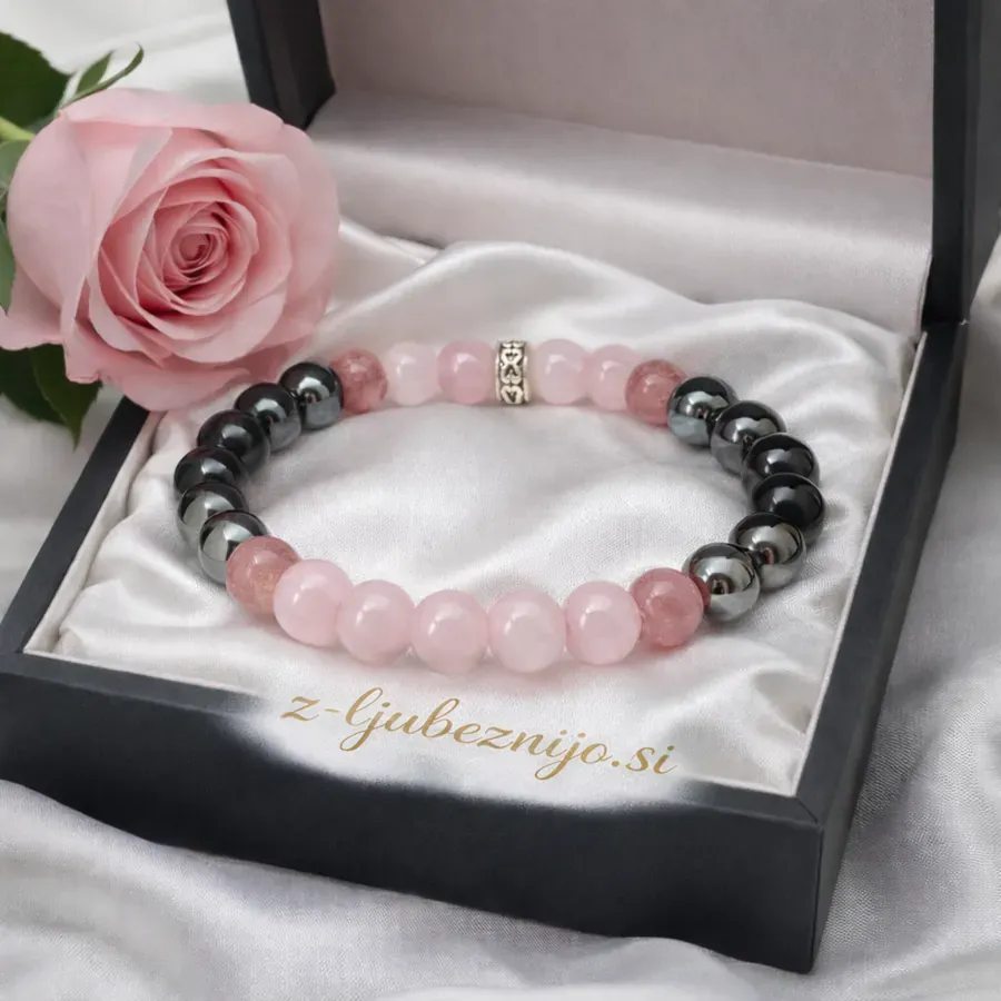 Kamnita kombinacija v zapestnici podpira prav to stanje. Roževec nežno odpira srce za toplino, sprejemanje in sočutje. Hematit prinaša občutek stabilnosti, prizemljenosti in notranje opore. Obsidian pa varuje prostor okoli tebe in pomaga spuščati stare strahove ter dvome.
