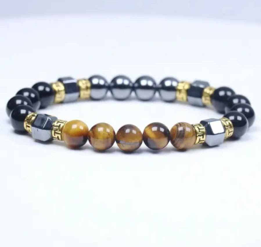 V teh zapestnicah se srečujejo tri močne energije. Barvno tigrovo ali mačje oko deluje kot energijski prevodnik, ki nežno odpira specifične čustvene tokove in notranje uvidenje. Obsidian je zaščitnik – močan, temen kamen, ki deluje kot ogledalo resnice in hkrati kot ščit pred zunanjimi vplivi. Hematit pa prinaša globoko stabilnost in prizemljitev, usmerja tvojo energijo navznoter in ti pomaga ohranjati jasnost tudi v čustvenem kaosu.